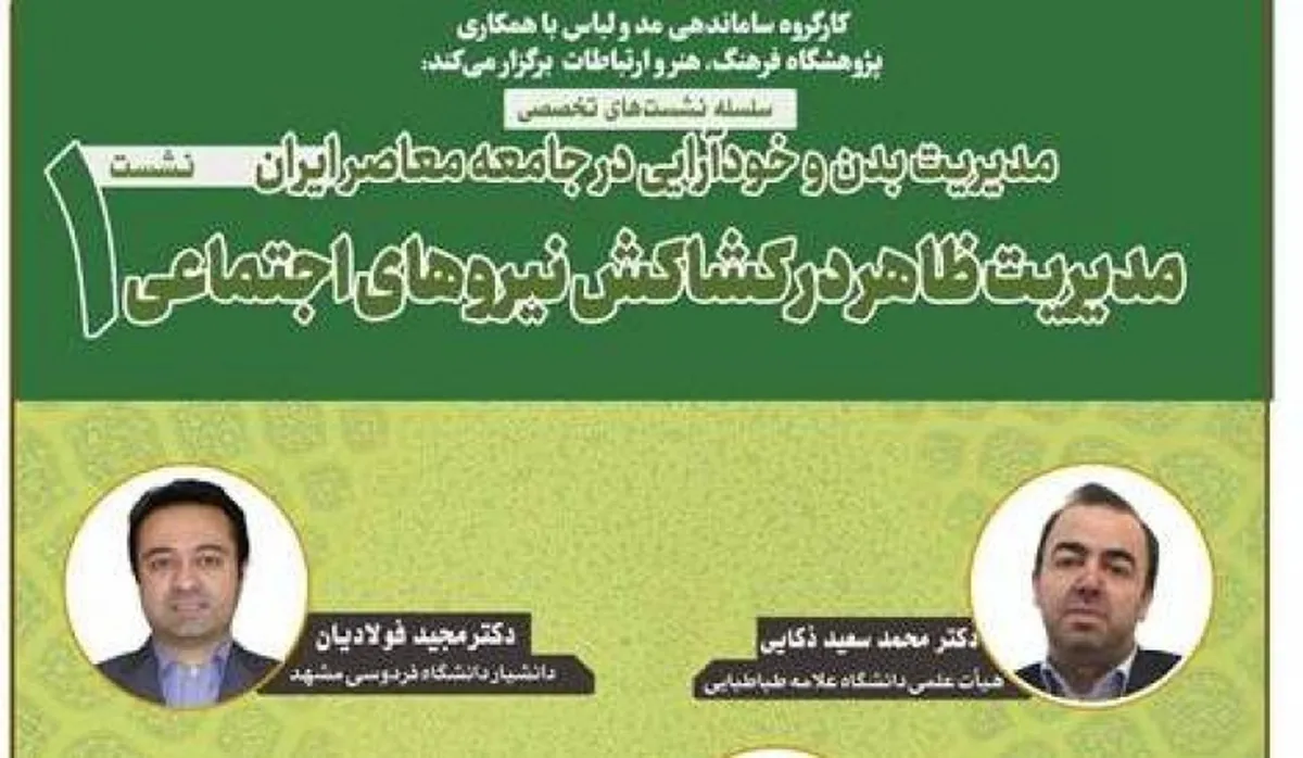 سلسلهنشستهای تخصصی «مدیریت بدن و خودآرایی در جامعه معاصر ایران» از سوی پژوهشگاه فرهنگ، هنر و ارتباطات و با همکاری گروه ساماندهی مد و لباس برگزار میشود.