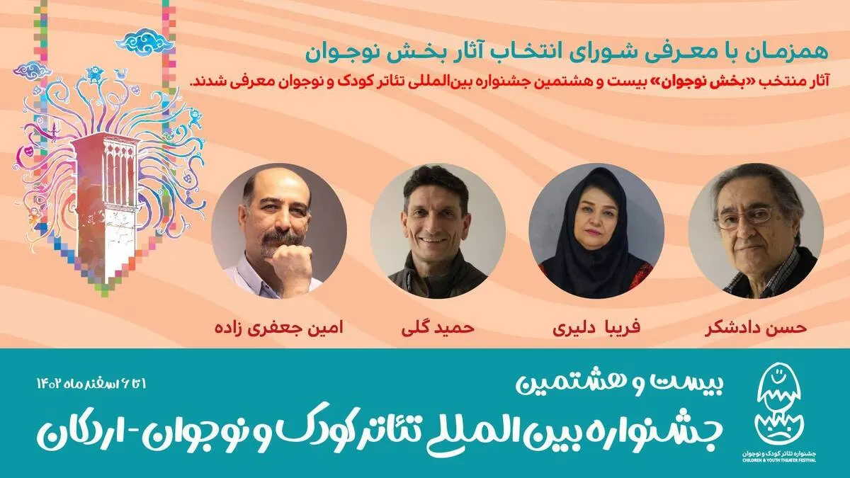 به گزارش گروه فرهنگ و جامعه خبرگزاری علم و فناوری آنا، طی احکامی جداگانه از سوی امیر مشهدی عباس دبیر بیست و هشتمین جشنواره بینالمللی تئاتر کودک و نوجوان، اعضای هیات انتخاب آثار بخش نوجوان این رویداد نمایشی متشکل از حسن دادشکر، حمید گلی، امین جعفریزاده و فریبا دلیری معرفی شدند. اعضای این شورا پس از ارزیابی ۱۰۲ اثر ارسالی به این بخش از جشنواره بیست و هشتم، ۴ اثر را به صورت قطعی و ۴ اثر را مشروط به بازبینی مجدد برای حضور در جشنواره به شرح زیر انتخاب کردند.