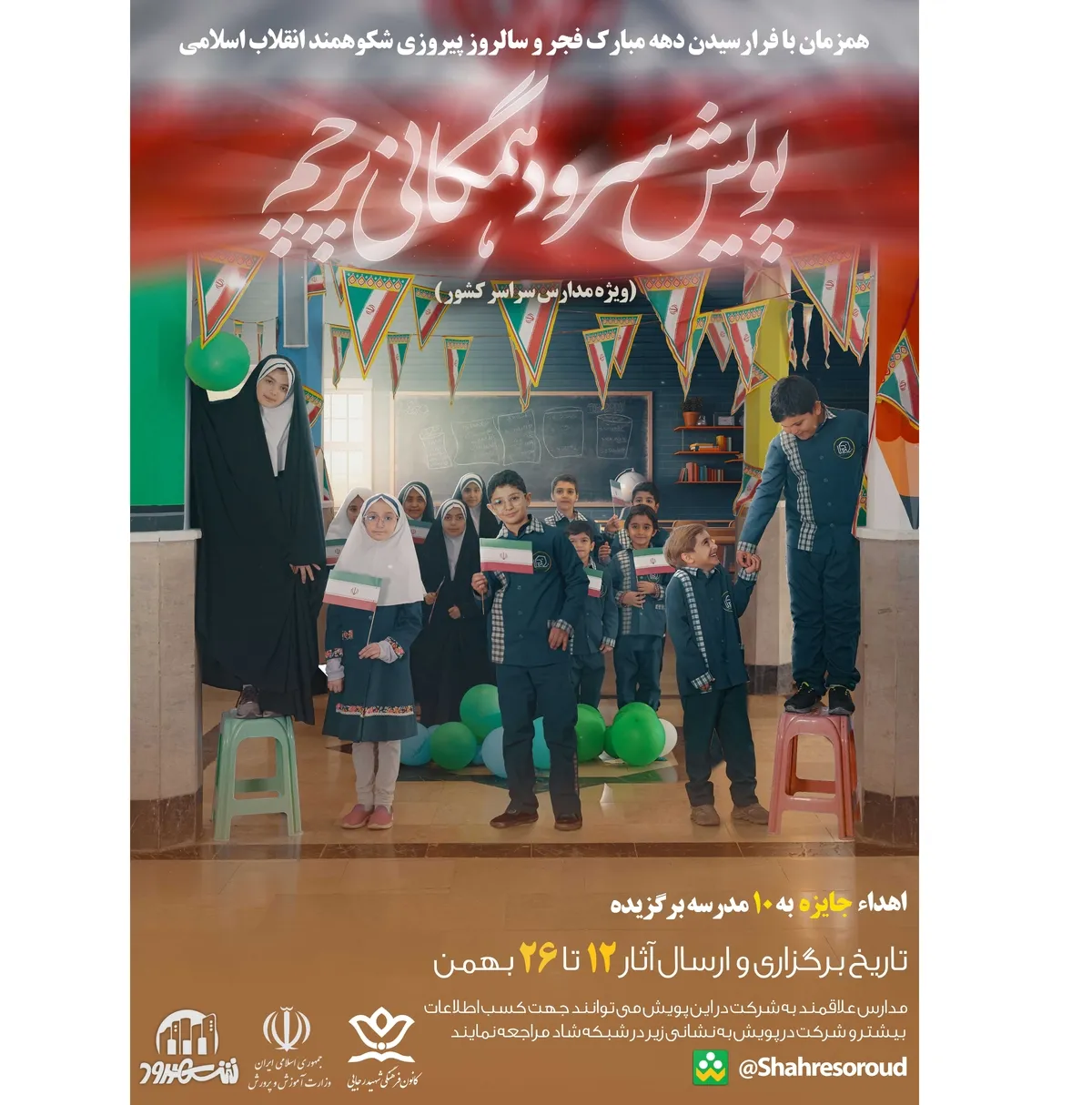 در این پویش که به مناسبت جشنهای دهه مبارک فجر در حال برگزاری است، قرار شده مدارس قطعه سرود پرچم را توسط دانشآموزان به صورت همگانی اجرا کنند و ویدئوی اجرای خود را به دبیرخانه پویش به آدرس shahresoroud@ در پیامرسان شاد ارسال کنند تا بعد از داوری به اجراهای برتر هدایایی اهدا شود.
