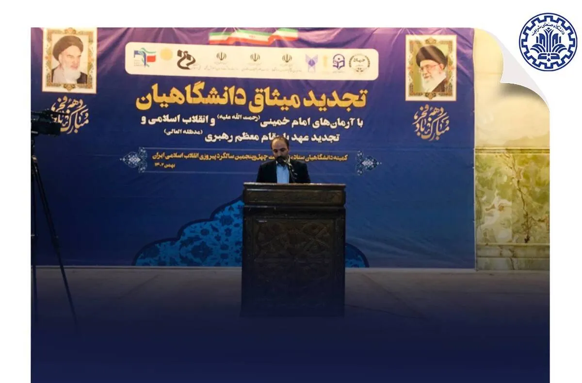 ضمن تبریک ایام پر خیر و برکت ماه رجب، و تبریک پیروزیها و دلاورمردیهای سپاه پرافتخار پاسداران انقلاب اسلامی در دفاع از کیان و مرزهای جمهوری اسلامی و آرزوی پیروزی رزمندگان جبهه مقاومت اسلامی علیه رژیم اشغالگر صهیونیستی، در آستانه چهل و پنجمین بهار پیروزی انقلاب اسلامی، ما دانشگاهیان ایران زمین، سالروز پیروزی شکوهمند انقلاب اسلامی را به همه ملت شریف ایران، مسلمانان و مستضعفان جهان تبریک میگوییم و در این مکان مطهر به روح بلند و ملکوتی امام راحل (ره) و شهیدان همیشه حاضر درود میفرستیم و با آرمانهای انقلاب اسلامی و بنیانگذار کبیر آن تجدید میثاق نموده، با مقام معظم رهبری امام خامنهای تجدید بیعت مینمائیم که تا آخرین نفس و تا ظهور آخرین منجی، مهدی موعود (عج)، انقلابمان و خون شهیدانمان را پاس بداریم؛ و با صدای بلند و ندای رسای الله اکبر خامنهای رهبر اعلام میداریم: