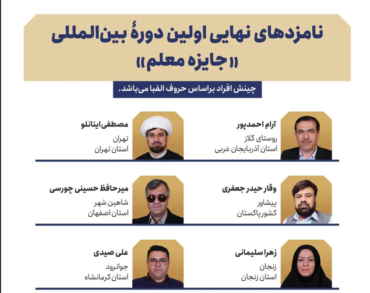 ۶ معلم به عنوان نامزد‌های نهایی اولین دوره بین‌المللی «جایزه معلم» معرفی شدند.