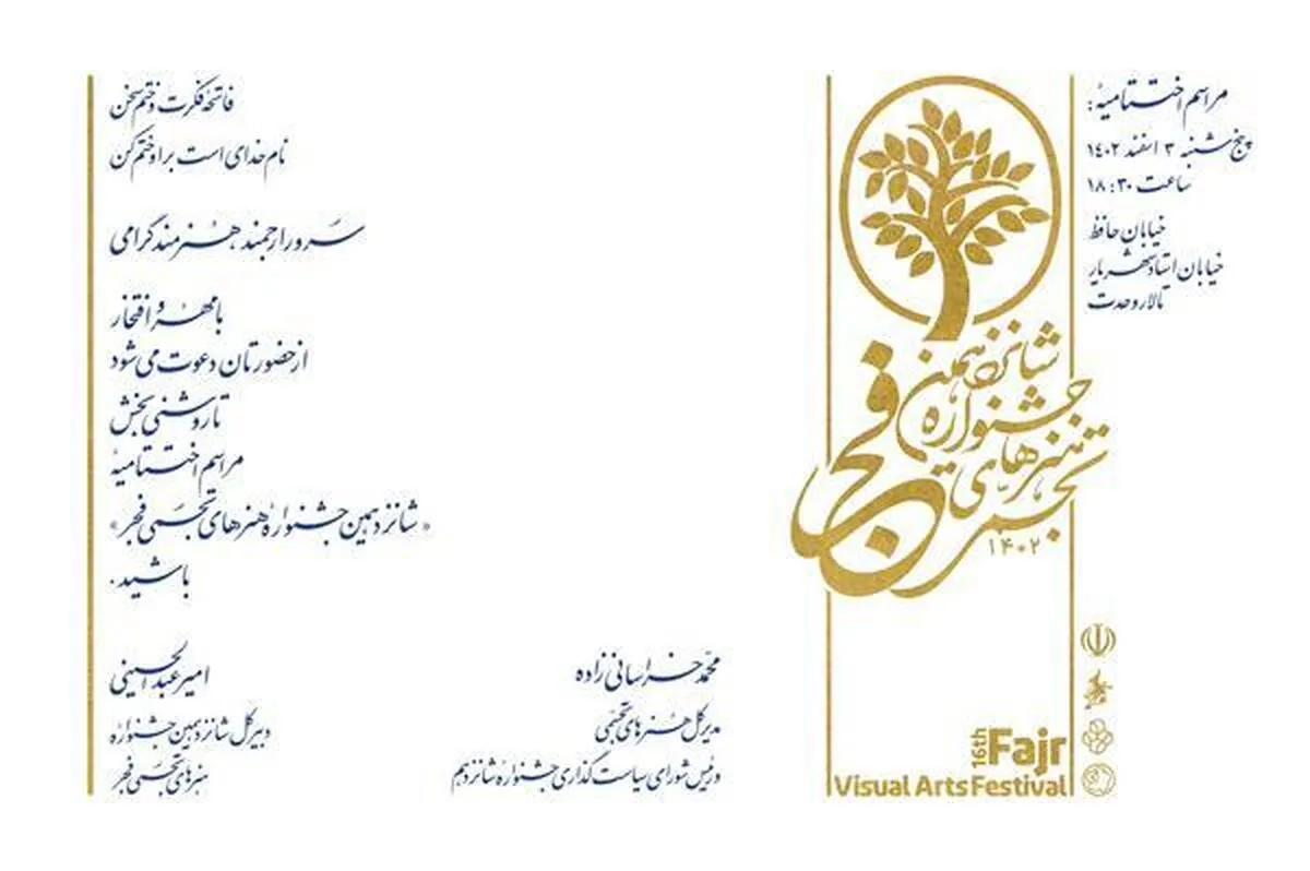 به گزارش گروه فرهنگ و جامعه خبرگزاری علم و فناوری آنا،، آیین اختتامیه شانزدهمین جشنواره هنرهای تجسمی فجر، روز پنجشنبه ۳ اسفند از ساعت ۱۸:۳۰ با حضور مسئولان هنری، دبیران و داوران جشنواره، استادان هنرهای تجسمی، هنرمندان و هنردوستان، در تالار وحدت برگزار میشود.