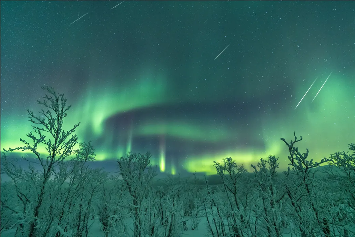 پنج شهاب از بارش شهابی جوزایی در آسمان بالای جنگل یخزدهای در شمال سوئد دیده میشوند. این تصویر در دمای -30 درجه سانتیگراد ثبت شد. تصویر اصلی با نوردهی طولانی 10 ثانیهای است و با f/2.8 و ISO 3200 گرفته شد. سپس عکاس آن را با چهار عکس دیگر ادغام کرد.
