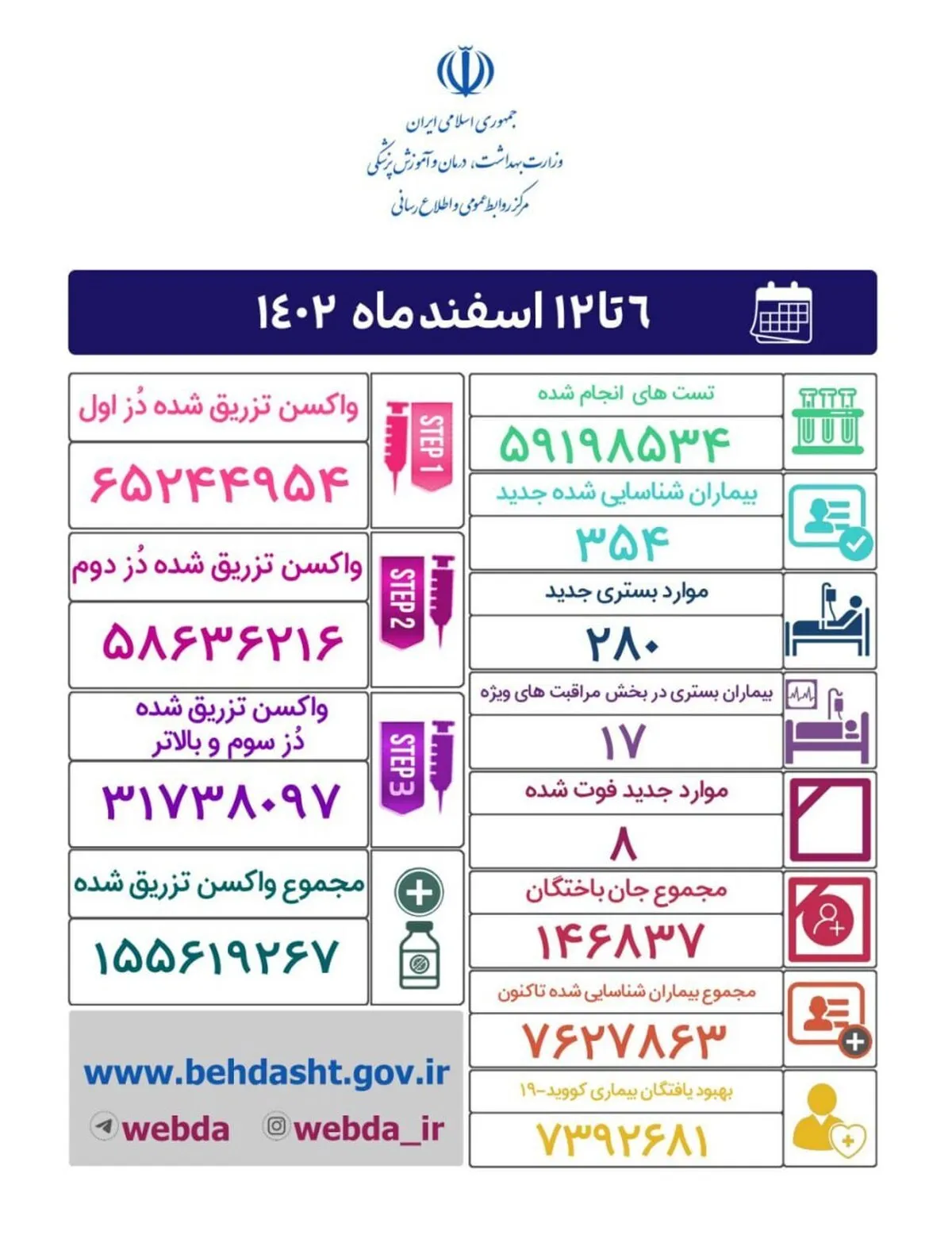 به گزارش گروه سلامت خبرگزاری علم و فناوری آنا، مرکز روابط عمومی و اطلاعرسانی وزارت بهداشت اعلام کرد: از یکشنبه هفته گذشته تا امروز ۱۲ اسفند ماه ۱۴۰۲ و بر اساس معیارهای قطعی تشخیصی، ۳۵۴ بیمار جدید مبتلا به کووید۱۹ در کشور شناسایی و ۲۸۰ نفر آنها بستری شدند.