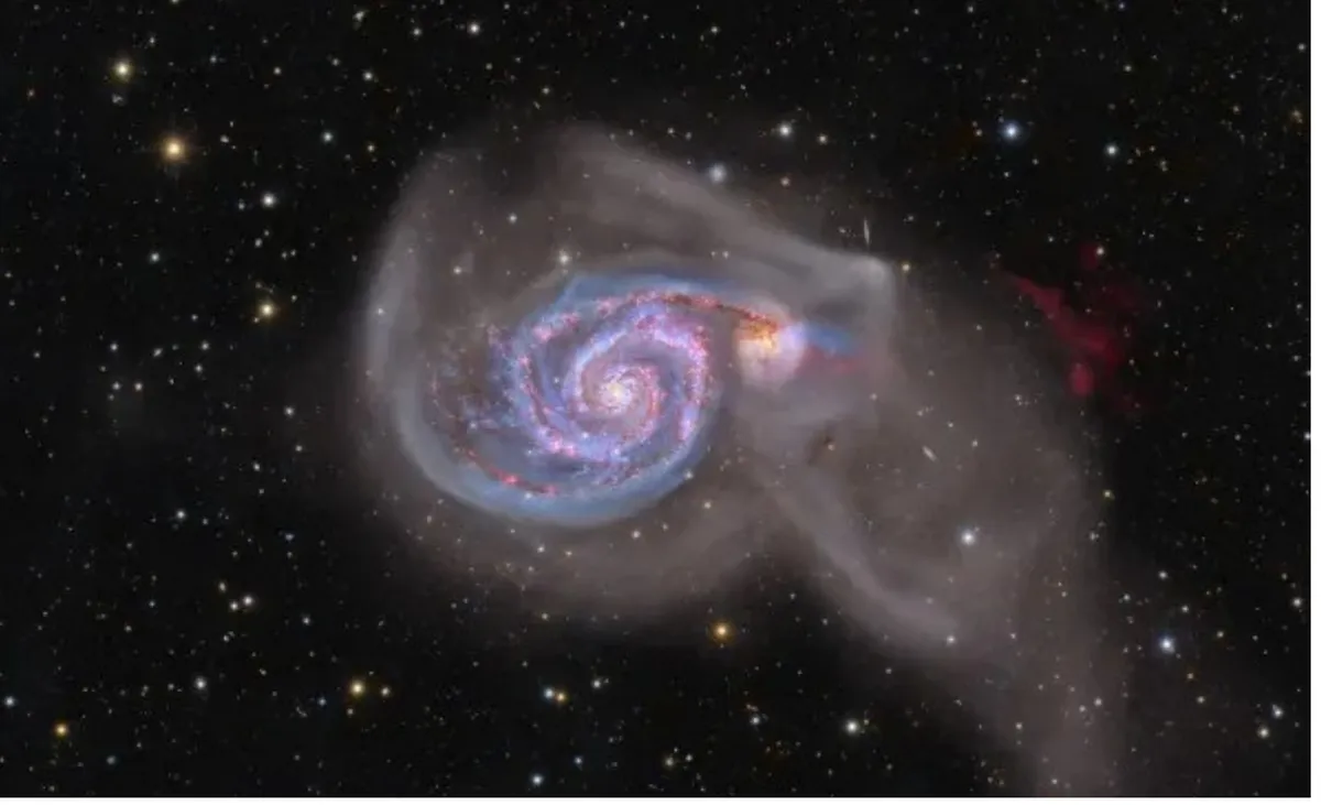 ثبت این تصویر دقیق از کهکشان گرداب (M51) 255 ساعت زمان برد. این تصویر سحابی سیروس-مانندی را در اطراف کهکشان نشان میدهد که از برهمکنش آن با کهکشان کوتوله NGC 5195 امتداد یافته است. فیلتر آلفا یک رگه قرمز را در سمت راست تصویر نشان میدهد.