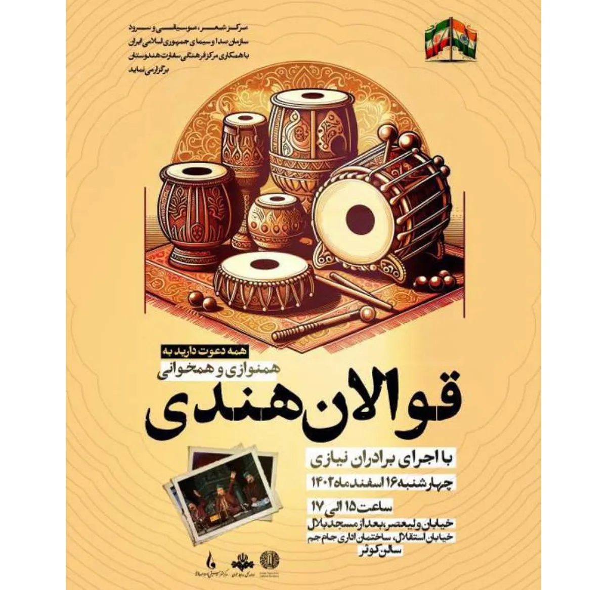 به گزارش خبرنگار فرهنگ و جامعه خبرگزاری علم و فناوری آنا، مراسم همنوازی و همخوانی گروه قوالی برادران نیازی «قوالان هندی» چهارشنبه ۱۶ اسفند ماه ساعت ۱۵ تا ۱۷ به همت مرکز شعر، موسیقی و سرود سازمان صدا و سیما و همکاری مرکز فرهنگی سفارت هند برگزار میشود.