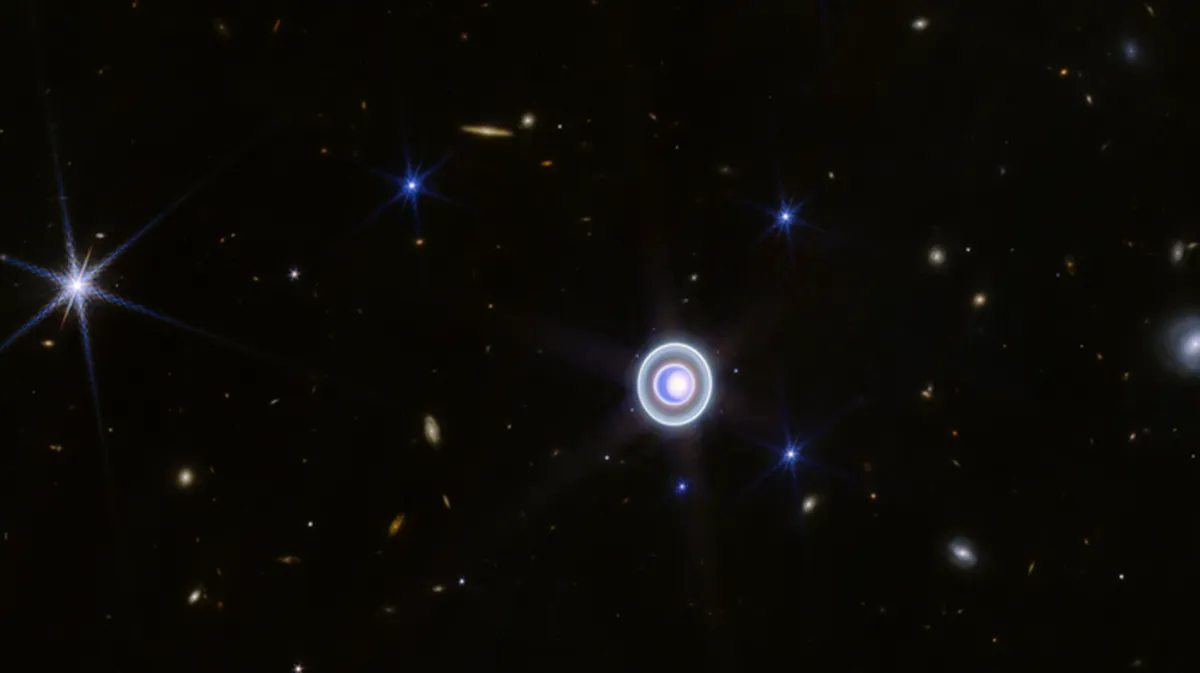 اورانوس غول یخی در اینجا توسط جیمز وب ثبت شده است، این سیاره دنیایی پویا با چندین و چند حلقه، قمر، طوفان، فصول شدید و... است. حساسیت جیمز وب در حدی است که حتی حلقه نزدیک زتا را که کم رنگ، پراکنده و گریزان است به تصویر کشیده است. این تصاویر جدید ویژگیهای دقیق کلاهک فصلی قطب شمال اورانوس و همچنین طوفانهای درخشان در نزدیکی و زیر مرز جنوبی کلاهک را نشان میدهد. اگر انسانها میخواهند یک فضاپیما را برای بازدید از اورانوس از نزدیک بفرستند، لازم است بدانیم چگونه میتوان اجرام حلقههای آن را به شکل دلخواه هدایت کند.