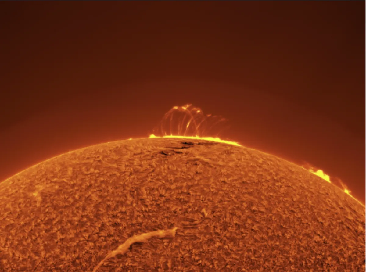 نمای درخشانی از خورشید که در 29 ژانویه طلوع می‌کند. مجموعه‌ای از حلقه‌ها در بالای آن تشکیل می‌شود. این تصویر با یک تلسکوپ خورشیدی 2.4 اینچی Hα و یک دوربین تک رنگ CCD گرفته شده است.