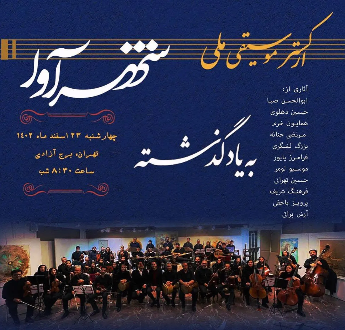 کنسرت ارکستر ملی «شهرآوا» روز چهارشنبه بیست و سوم اسفند ماه از ساعت ۲۱ در سالن برج آزادی برگزار میشود.