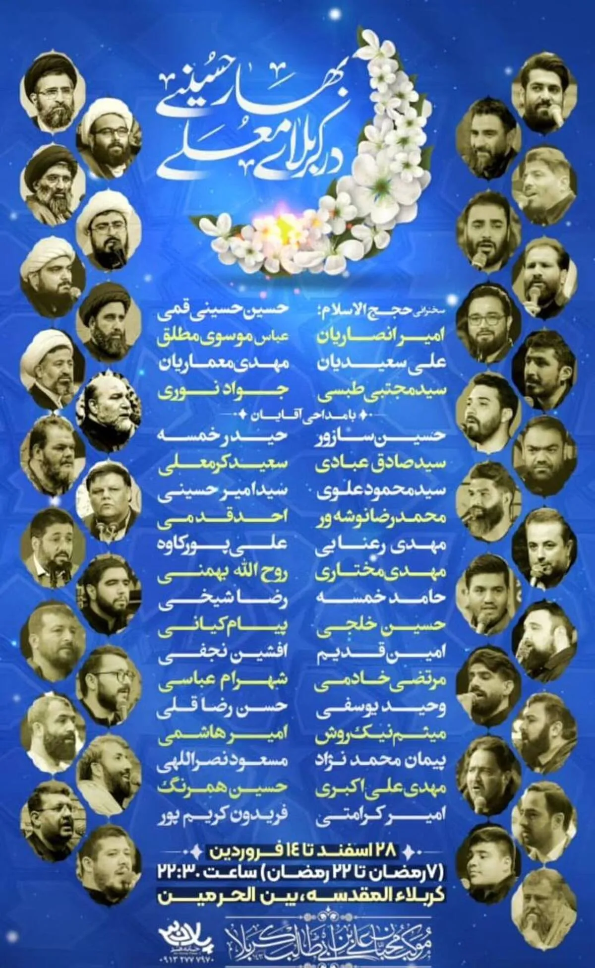 امسال مراسم بهار حسینی با حضور بیش از ۳۵ مداح و واعظ کشورمان از ۲۸ اسفند تا ۱۴ فرودین در کربلا برگزار میشود.