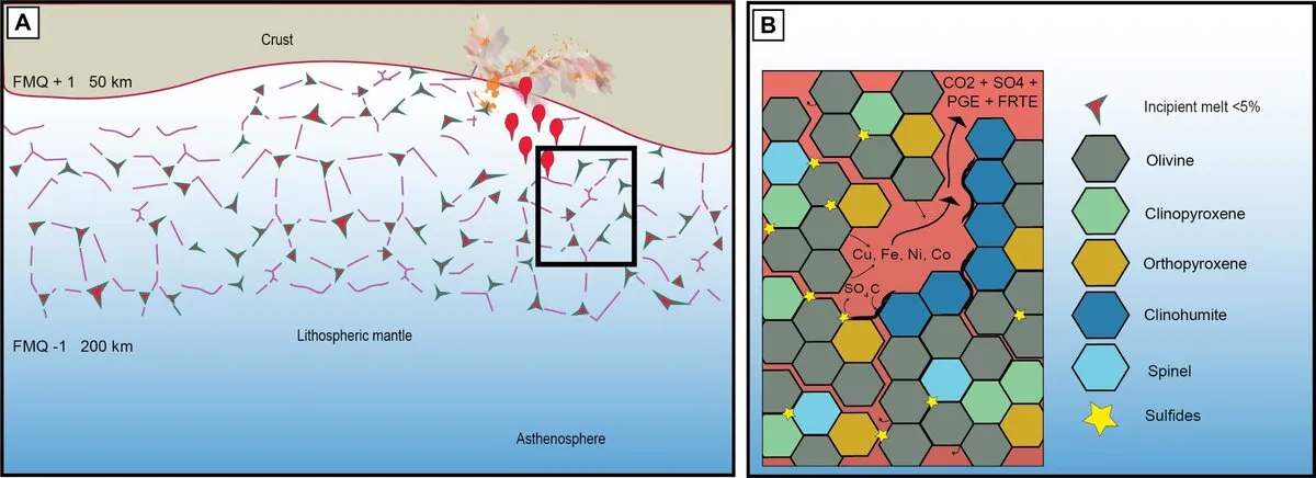 او اضافه میکند: «به نظر میرسد مذابهای کربن-گوگرد این فلزات را در مناطق گسسته گوشته حل کرده و متمرکز میکند و آنها را به اعماق پوستۀ کم عمق میبرد. در آنجا فرآیندهای شیمیایی پویا میتواند منجر به تشکیل رسوب سنگ معدنی شود.»