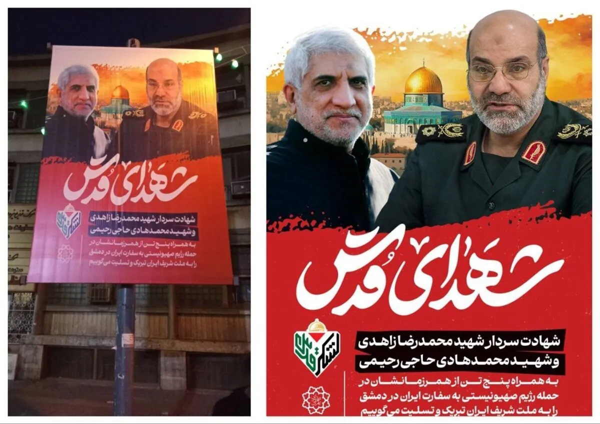 به گزارش گروه فرهنگ و جامعه خبرگزاری علم و فناوری آنا، همزمان با به شهادت رسیدن سرداران شهید مدافع حرم محمدرضا زاهدی و محمد هادی حاجی رحیمی به همراه پنج تن از همرزمانشان در حمله ناجوانمردانه رژیم صهیونیستی به سفارت ایران در دمشق به همت سازمان زیباسازی طرحهای فرهنگی «شهدای قدس» که به تبریک و تسلیت شهادت این شهیدان والامقام پرداخته است، در فضای شهری پایتخت اکران شد.