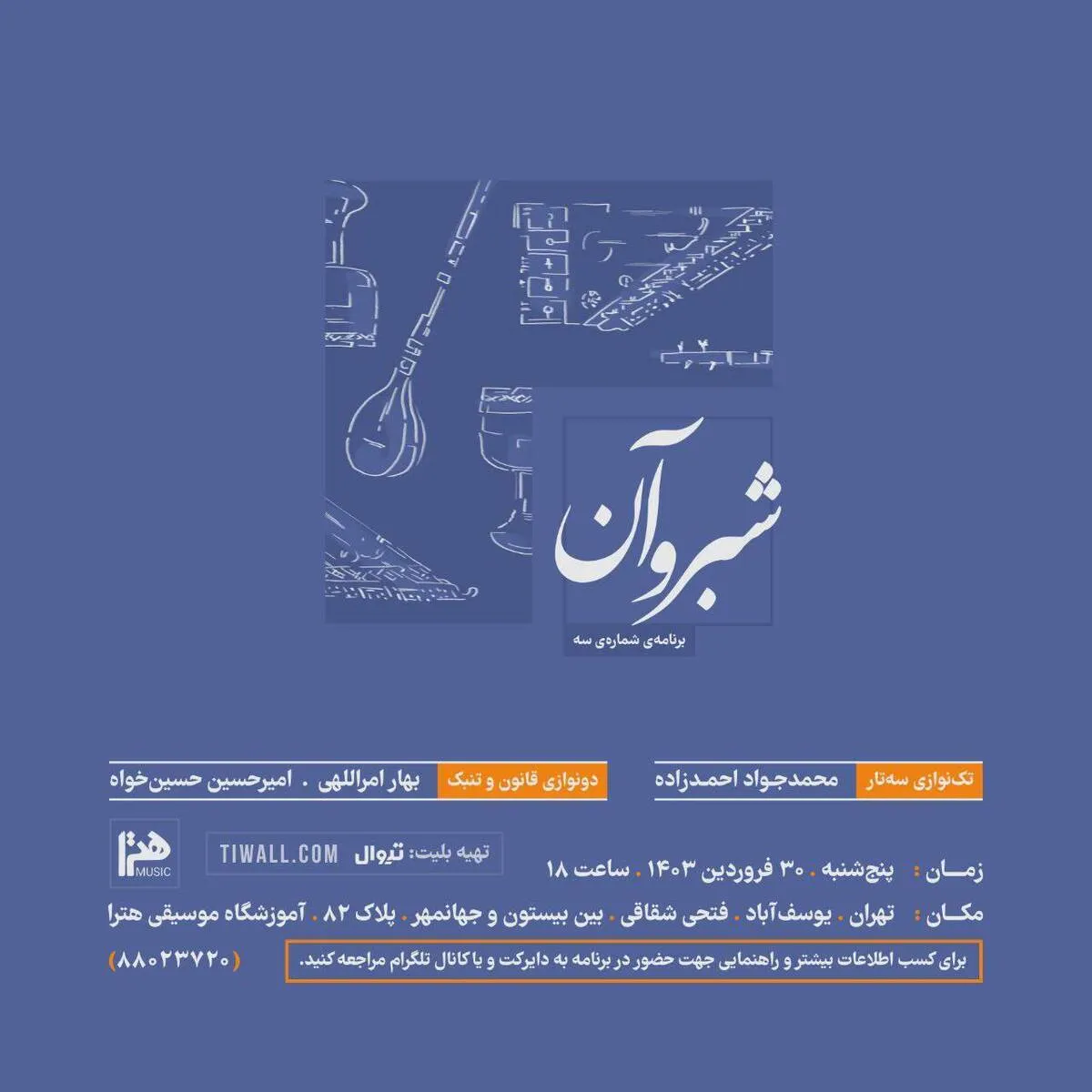 اجرای موسیقی ایرانی «شبروآن» پنجشنبه ۳۰ فروردین از ساعت ۱۸ در آموزشگاه موسیقی «هترا» به نشانی تهران، یوسفآباد، خ فتحی شقاقی بین بیستون و جهانمهر، پلاک ۸۲ برگزار میشود. علاقهمندان میتوانند بلیتهای این کنسرت را از طریق سایت tiwall.com تهیه کنند.