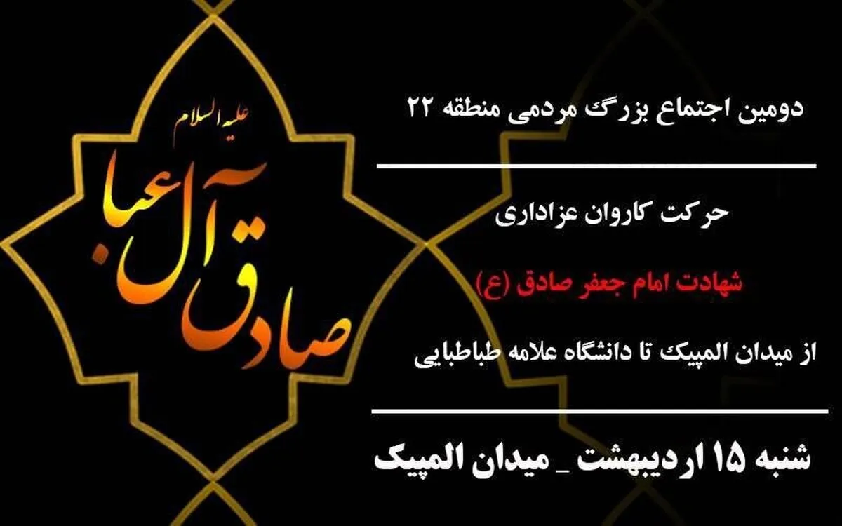 به گزارش گروه فرهنگ و جامعه خبرگزاری علم و فناوری آنا، مرتضی تنها مدیر فرهنگی هنری منطقه22 از دومین اجتماع بزرگ مردمی منطقه 22 خبر داد و گفت : ویژه برنامه صادق آل عبا در روز شنبه 15 اردیبهشت ماه همزمان با سالروز شهادت امام صادق علیه السلام از میدان المپیک با تلاوت قران کریم توسط قاری ممتاز دکترحسین جعفری شروع خواهد شد پس از آن ذاکر اهل بیت(ع) حاج محمد نیک آریا در سوگ امام جعفر صادق روضه خوانی خواهد کرد.