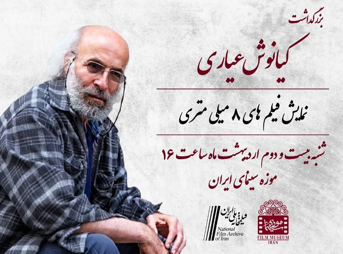 مراسم بزرگداشت کیانوش عیاری همراه با نمایش فیلمهای ۸ میلیمتری و ۴ فیلم سینمایی مرمتشده، از ۲۲ تا ۲۶ اردیبهشت در موزه سینما برگزار میشود.