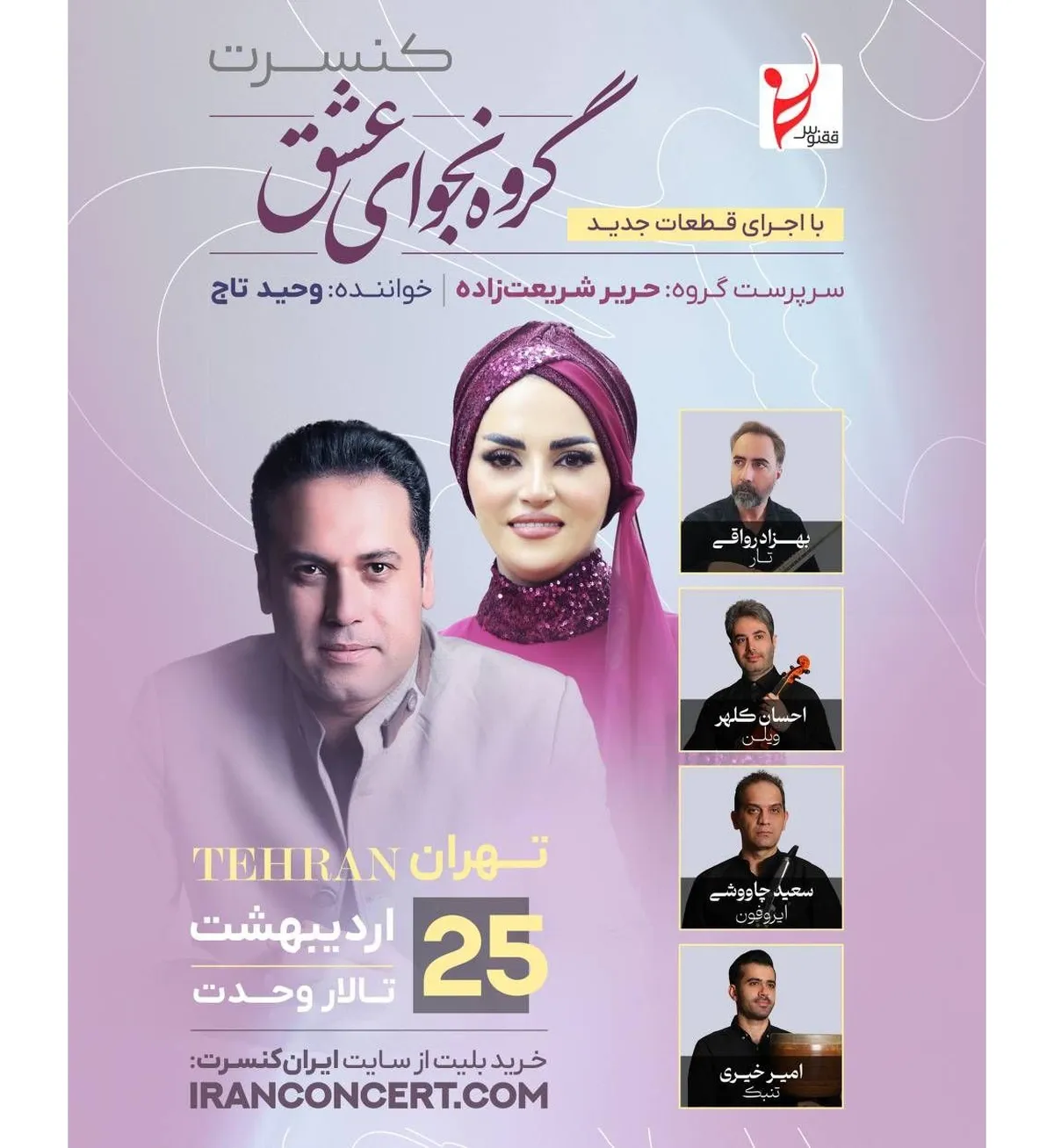 کنسرت گروه موسیقی نجوای عشق به سرپرستی حریر شریعت زاده و آواز وحید تاج، ۲۵ اردیبهشت در تالار وحدت برگزار میشود.