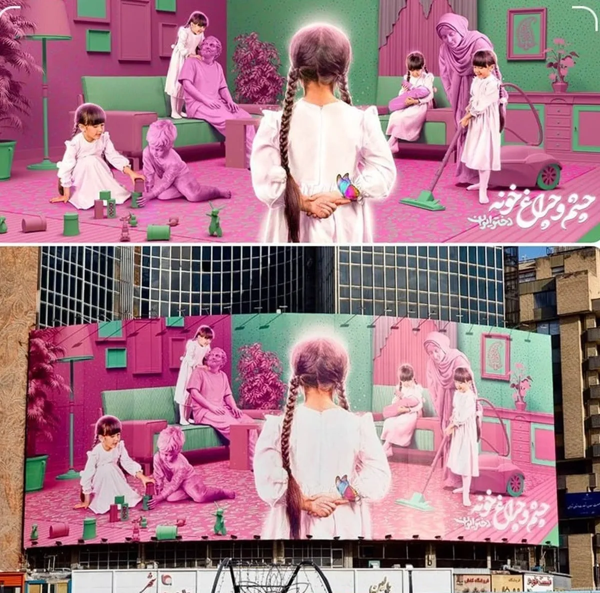 این دیوارنگاره با عنوان «چشم و چراغ خونه» به رنگ صورتی طراحی شده است.