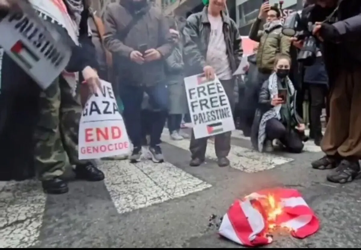 حامیان فلسطین در نیویورک پرچم آمریکا را آتش زدند+ فیلم