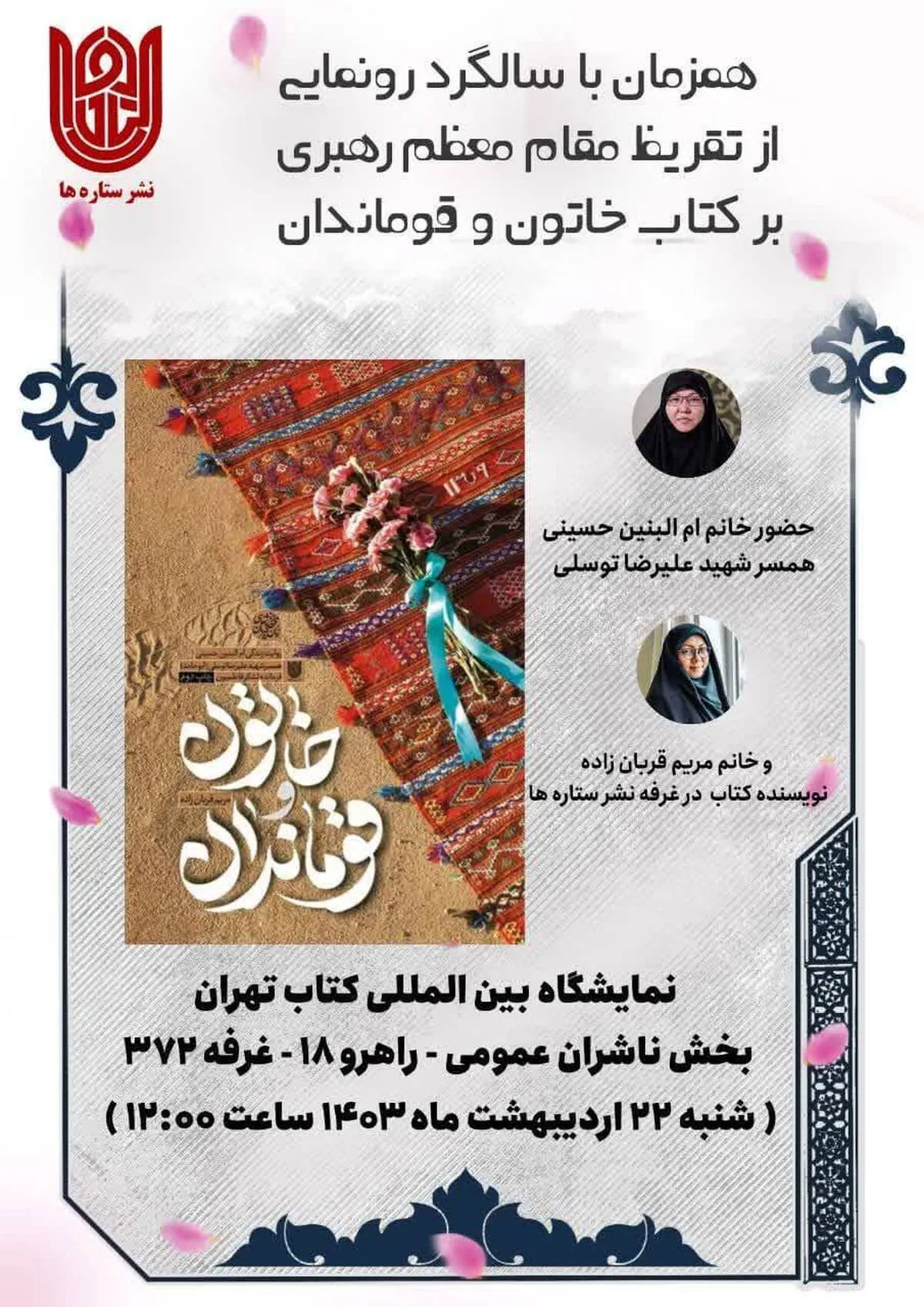 جلینی بیان داشت: به مناسبت هشتاد و پنجمین چاپ کتاب خاتون و قوماندان و به علت اینکه این کتاب یکی از پر مخاطبترین کتابهای سال گذشته بوده و همچنین سالگرد رونمایی از تقریظ حضرت آقا بر کتاب خاتون و قوماندان است، با حضور راوی خانم ام البنین حسینی همسر شهید علیرضا توسلی و نویسنده کتاب یعنی مریم قربان زاده و دوستان مجمع ناشران انقلاب اسلامی مراسمی در غرفه نشر ستارهها برگزار میشود.