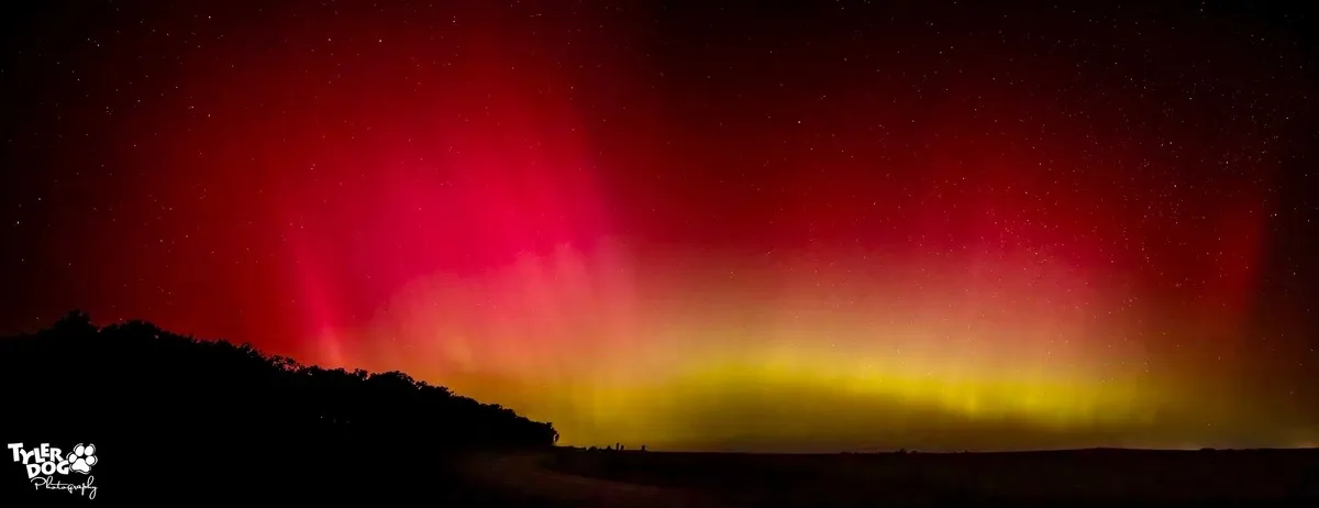 شفق قطبی آسمان شب را در نزدیکی شهر ملاد، آیداهو در ایالات متحده به رنگ قرمز، بنفش و سبزمشاهده میکنید. تصویر با نوردهی 8 ثانیهای در 11 می2024 گرفته شد.