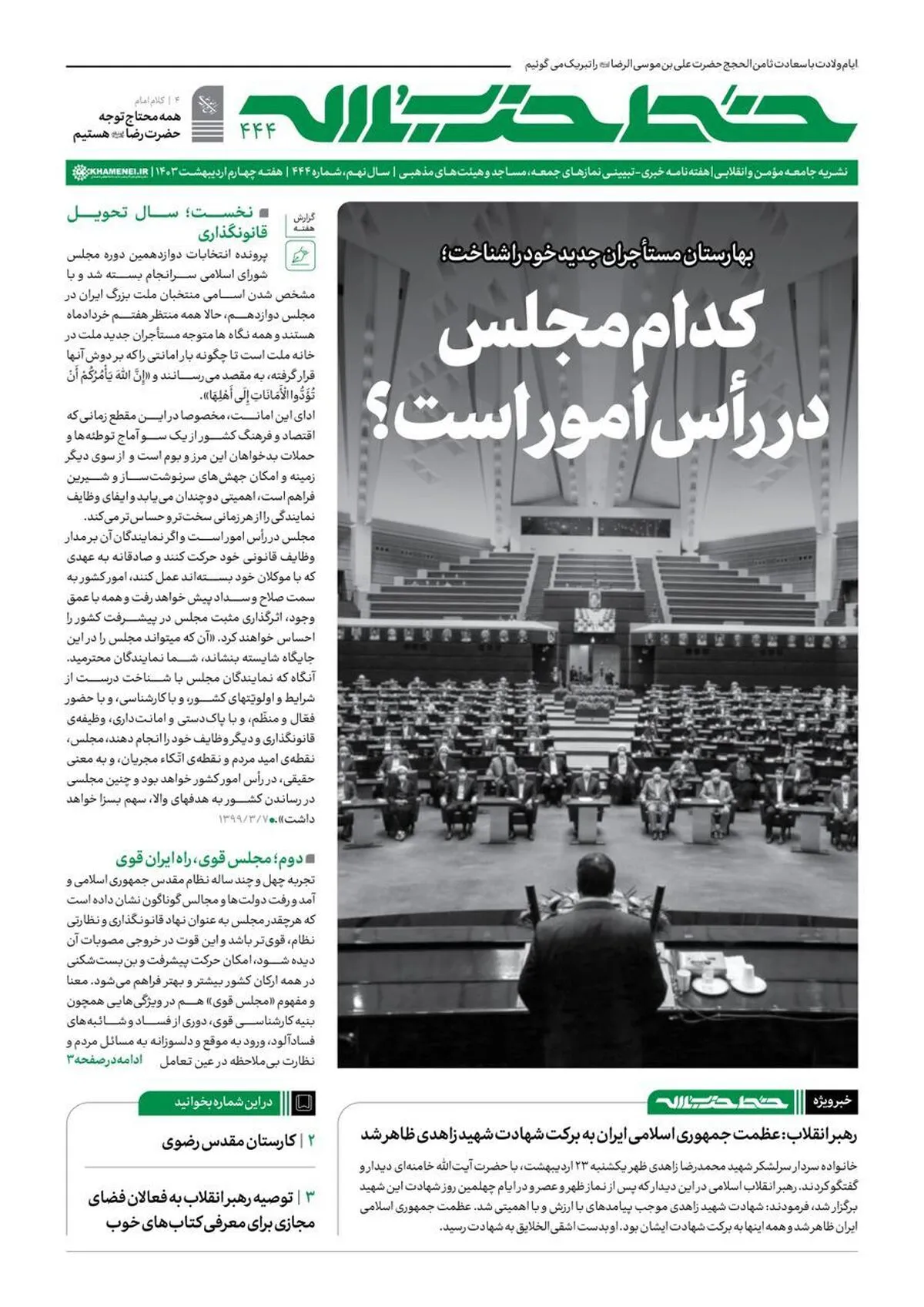 چهارصد و چهل و چهارمین شماره هفته‌نامه‌ خط حزب‌الله، با عنوان «کدام مجلس در رأس امور است؟»‌ منتشر شد.