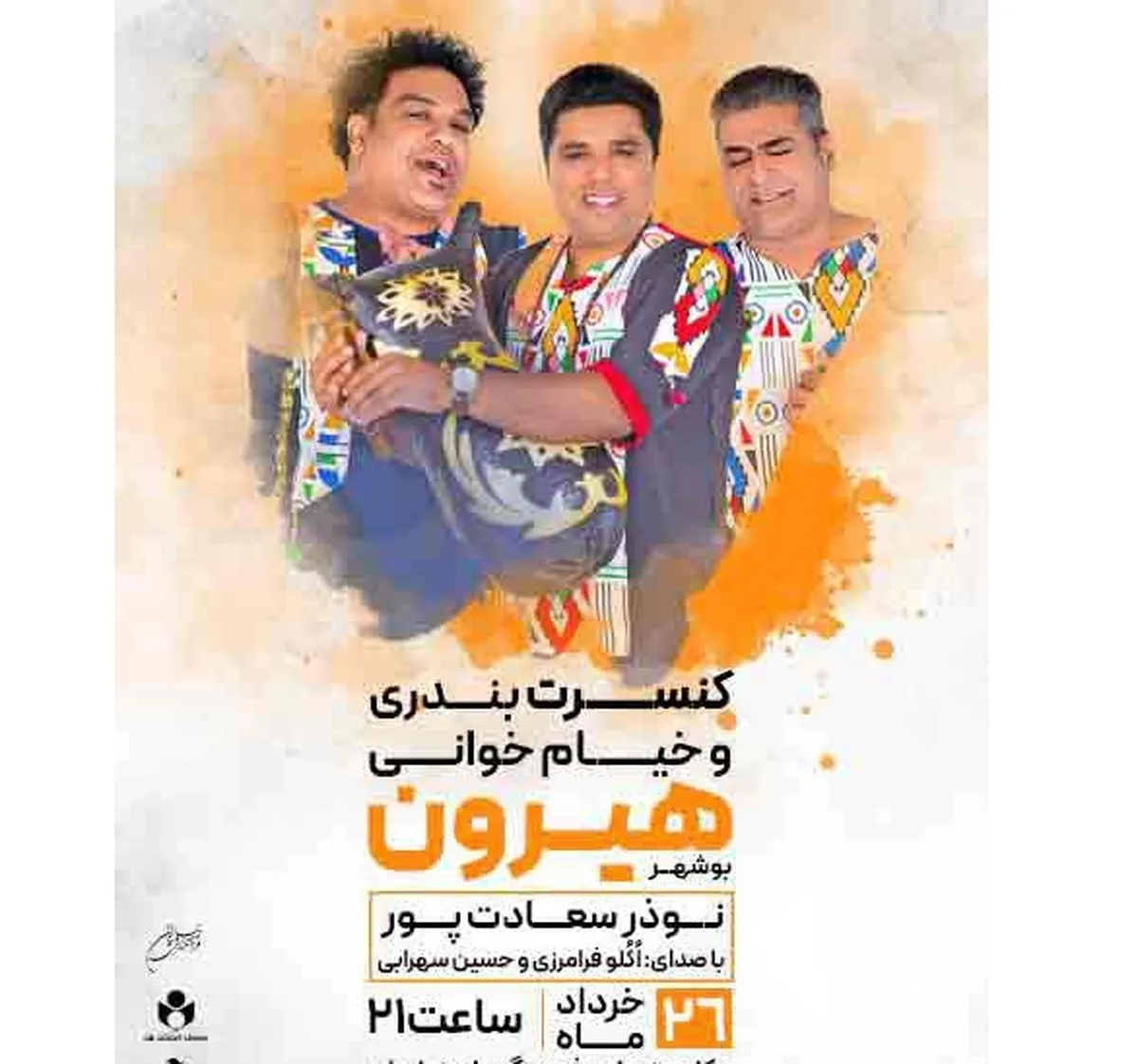 به گزارش گروه فرهنگ و جامعه خبرگزاری علم و فناوری آنا، گروه هیرون به سرپرستی «نوذر سعادت‌پور» با اجرای قطعات موسیقی بوشهری و بندری و همچنین خیام‌خوانی، روز شنبه ۲۶ خرداد ماه روی صحنه می‌رود.