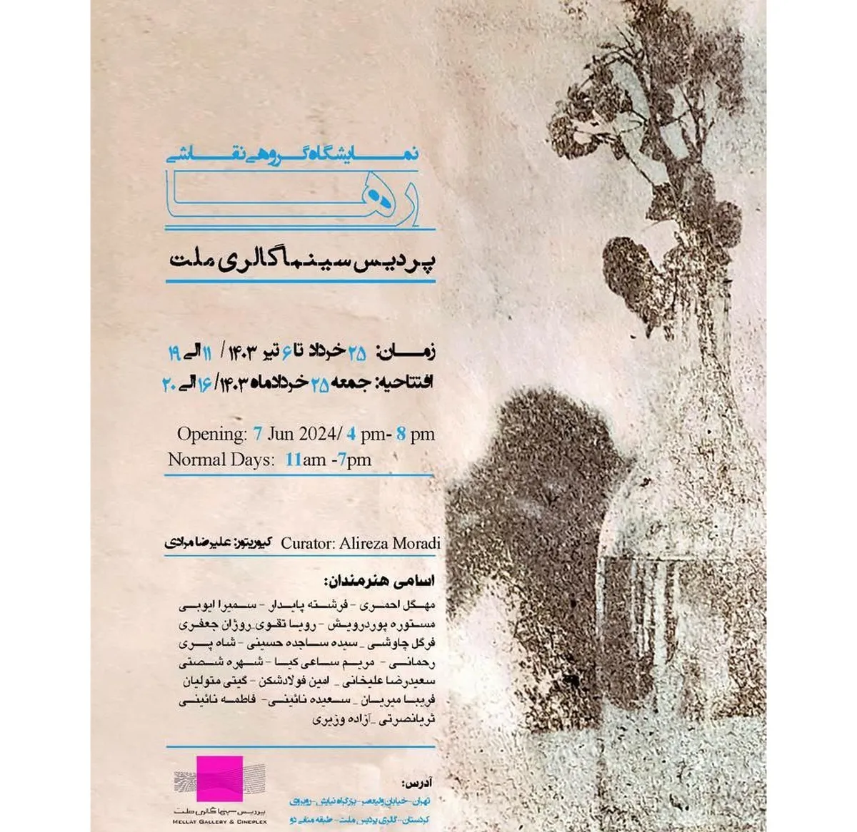 نمایشگاه «رها» روز جمعه بیست و پنجم خردادماه ۱۴۰۳ از ساعت ۱۶ الی ۲۰ در گالری پردیس ملت افتتاح می‌شود و تا ۶ تیرماه ادامه دارد.