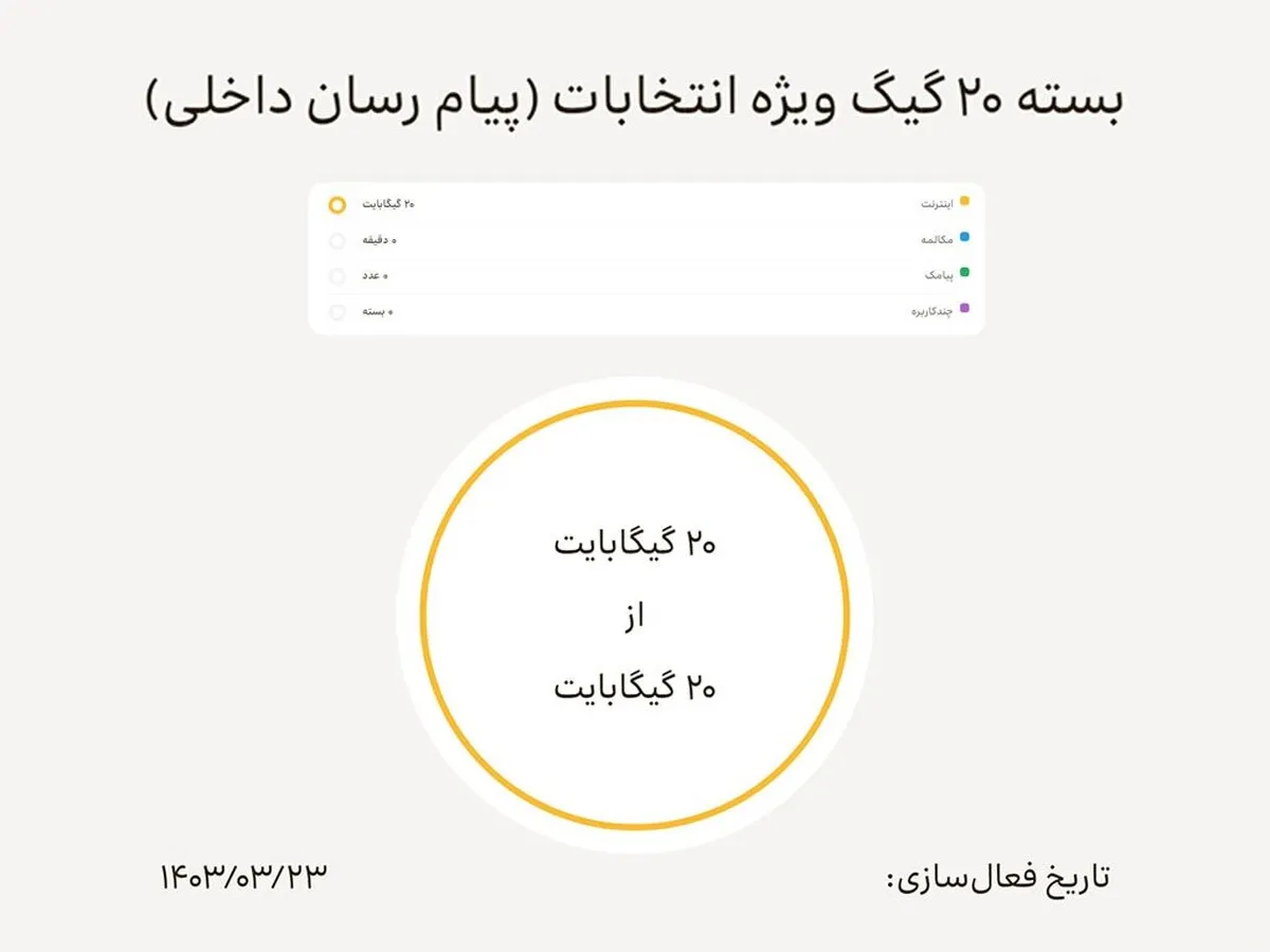 این بسته اینترنت رایگان با حجم ۲۰ گیگابایت، به منظور استفاده مشترکان در ایام تبلیغات انتخابات ریاست جمهوری ۱۴۰۳ و برای استفاده در سکوهای منتخب داخلی اعلامی وزارت ارتباطات و فناوری اطلاعات، شامل اپلیکیشن‌های لنز، ایتا، روبیکا، تلوبیون، ویراستی، سروش، گپ، آی‌گپ و بله در نظر گرفته شده است و با مدت یک ماه از شروع فعال‌سازی، قابل استفاده است.