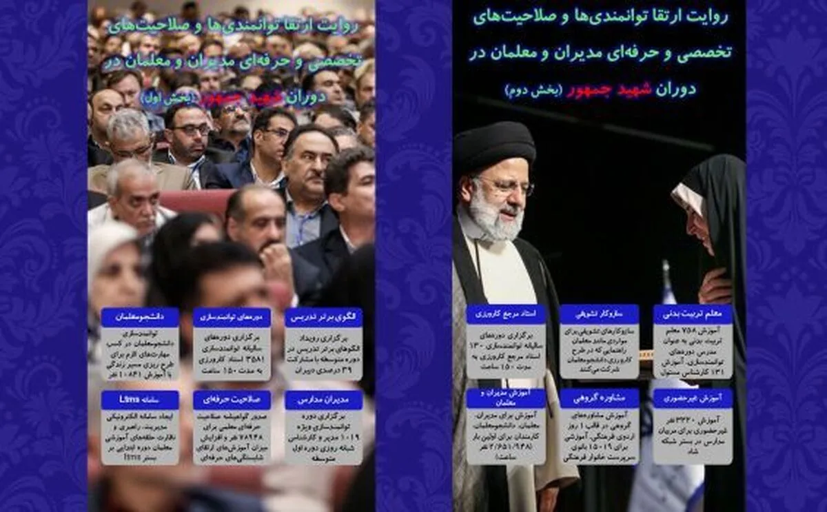 صدور گواهینامه صلاحیت حرفهای معلمی برای ۷۸۹۴۸ نفر و افزایش میزان آموزشهای ارتقای شایستگیهای حرفهای (۲۴ نفرساعته) مشاوران، (۱۲ نفر ساعته) رابطان و (۳۶ نفر ساعته) اعضای تخصصی مراکز رشد و مشاوره تربیتی از ۸۷۶.۲۹۰ نفر ساعت به ۳.۰۸۴.۹۹۴ نفر ساعت.