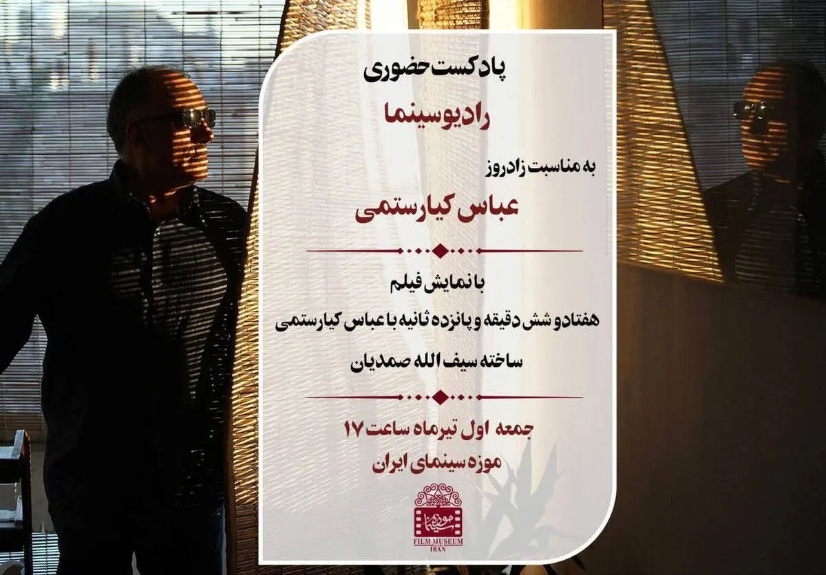 به گزارش گروه فرهنگ و جامعه خبرگزری علم و فناوری آنا، اول تیرماه همزمان با زادروز زنده یاد «عباس کیارستمی» ویژه برنامه این هنرمند فقید با عنوان «تولدت مبارک عباس کیارستمی» در موزه سینما برگزار می‌شود. این برنامه همراه با اجرای پادکستی از زندگی و فعالیت‌های عباس کیارستمی همراه خواهد بود که توسط شهراد بانکی و مژگان اصغری اجرا خواهد شد.
