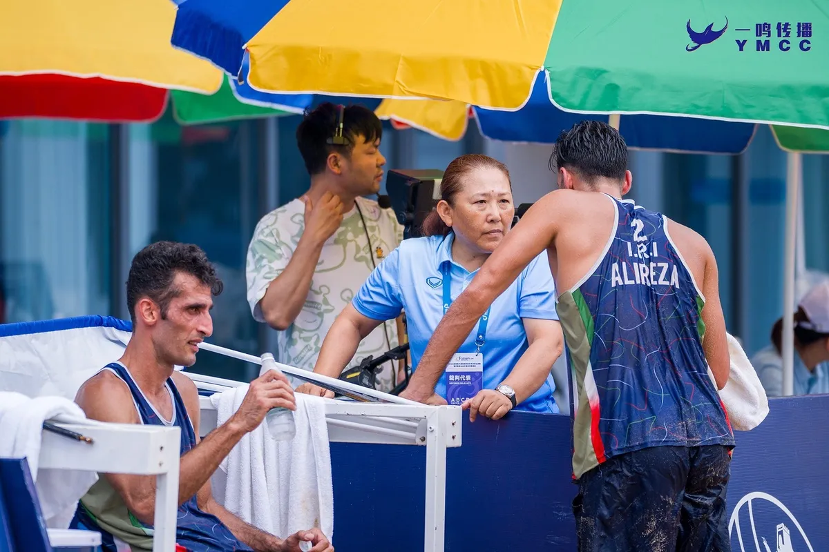 در این دیدارها که به صورت همزمان برگزار شد، ایران یک (پورعسگری و آقاجانی) در زمین یک برابر چین یک (وو – ها) به میدان رفت و در دو ست متوالی با امتیازهای ۲۱ بر ۱۸ و ۲۱ بر ۱۵ مغلوب شد.