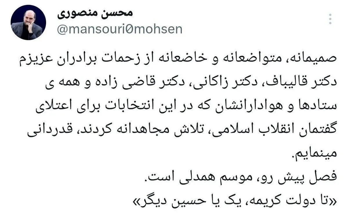 منصوری: متواضعانه از زحمات قالیباف، زاکانی و قاضیزاده و هوادارانشان تشکر میکنیم