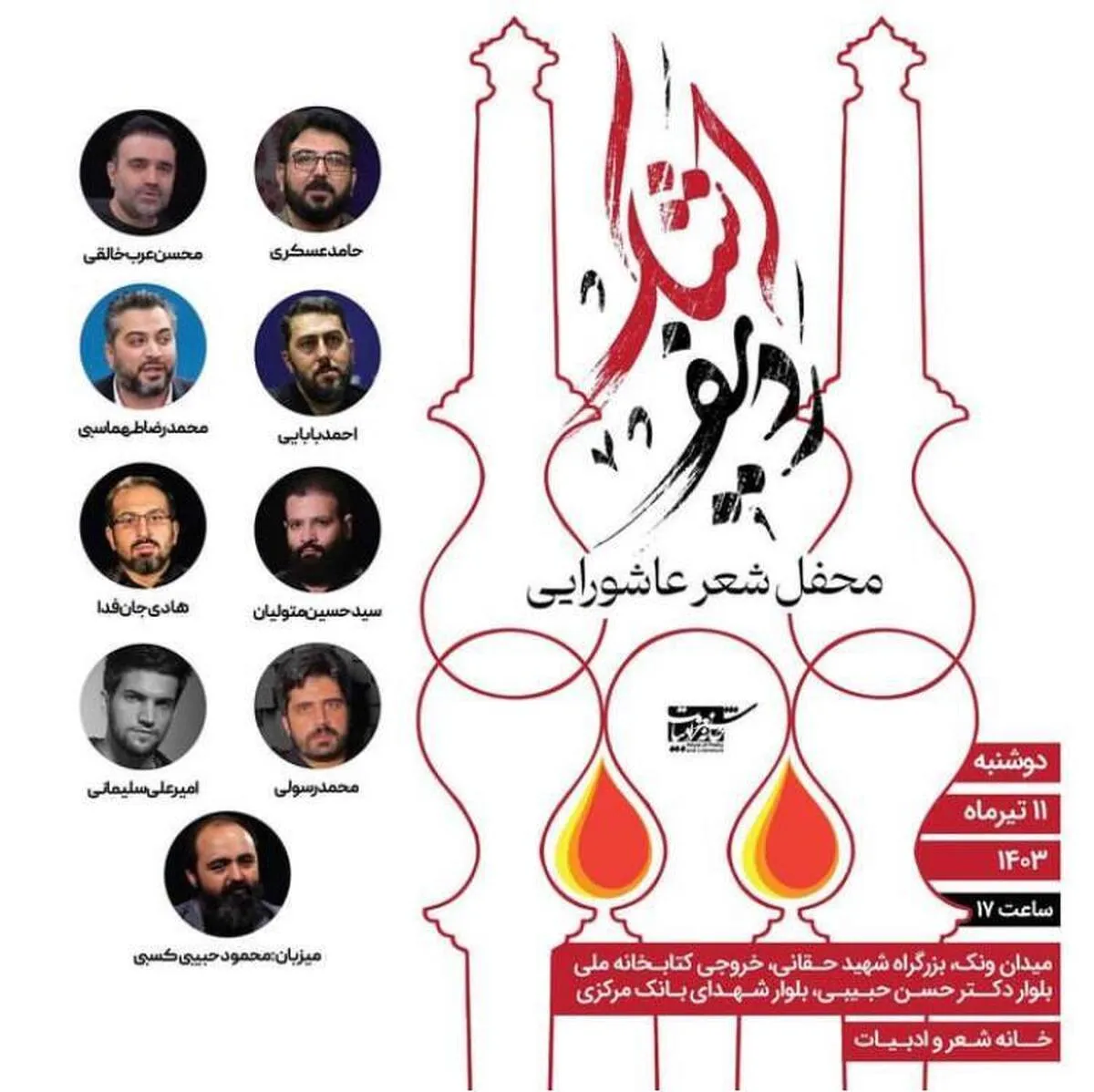 محفل شعر عاشورایی«ردیف اشک» به میزبانی محمود حبیبی کسبی، شاعر 11 تیرماه 1403 از ساعت 17 در «خانه شعر و ادبیات» برگزار میشود.