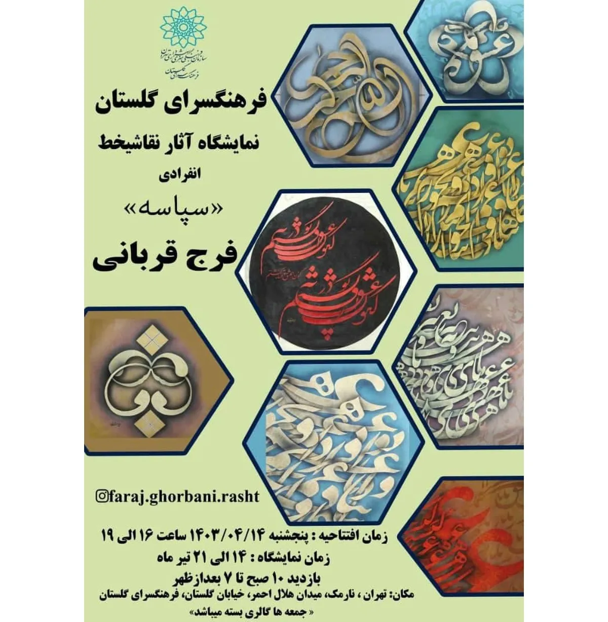 در این نمایشگاه، آثار نقاشیخط هنرمند نام آشنای کشور، فرج قربانی به نمایش درمیآید. براین اساس، ۳۰ تابلو نقاشیخط جدید وی در نگارخانه گلستان رونمایی میشود.