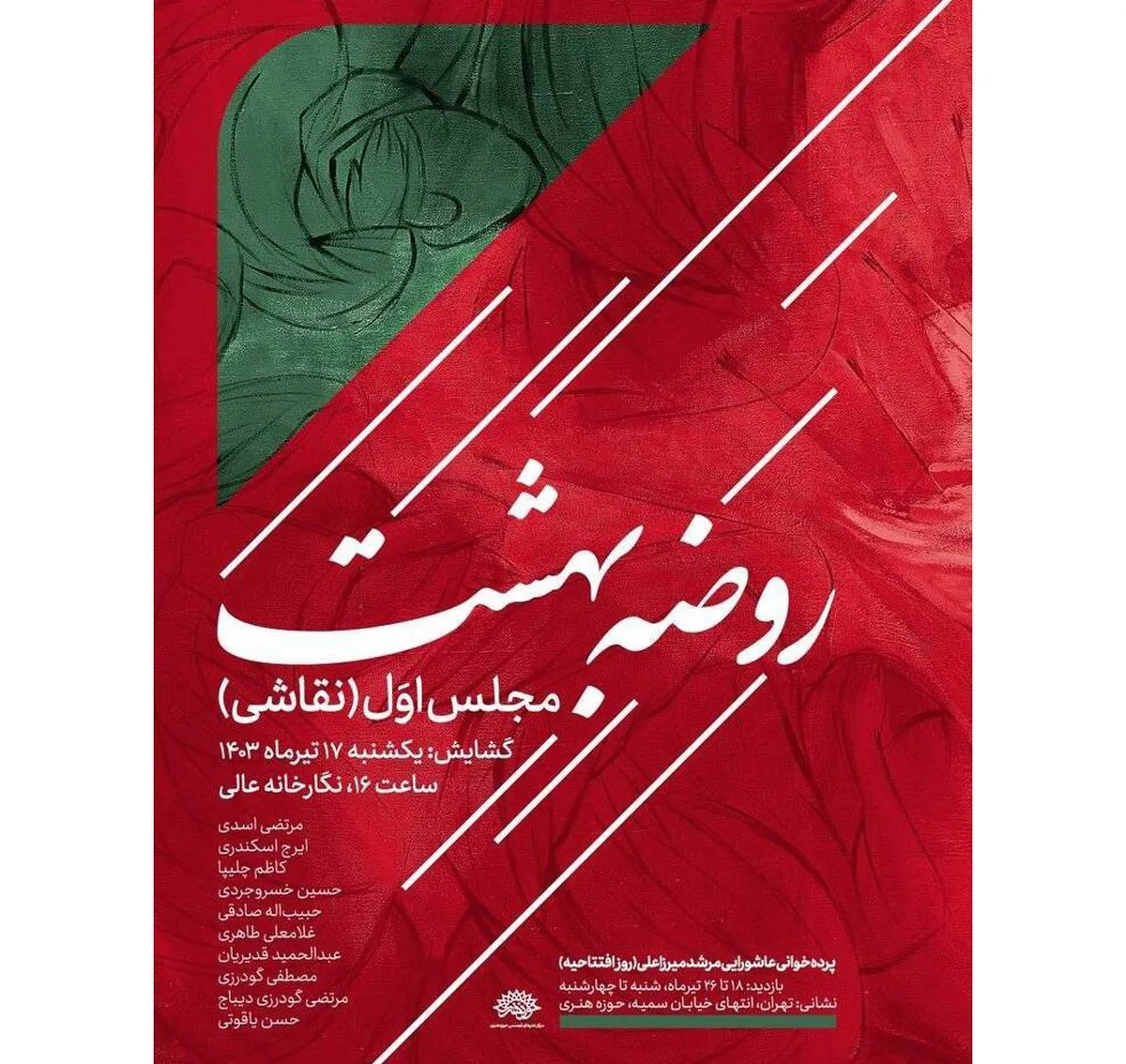 مجلس اول نمایشگاه گروهی «روضه بهشت» شامل ۱۰ تابلوی نقاشی از مرتضی اسدی، ایرج اسکندری، کاظم چلیپا، حسین خسروجردی، حبیباله صادقی، غلامعلی طاهری، عبدالحمید قدیریان، مصطفی گودرزی، مرتضی گودرزی دیباج و حسین یاقوتی خواهد بود که از ۱۸ تا ۲۶ تیرماه هر روز از ساعت ۹ تا ۱۹ در نگارخانه ابوالفضل عالی حوزه هنری واقع در خیابان سمیه، نرسیده به خیابان حافظ در معرض دید عموم قرار میگیرند.