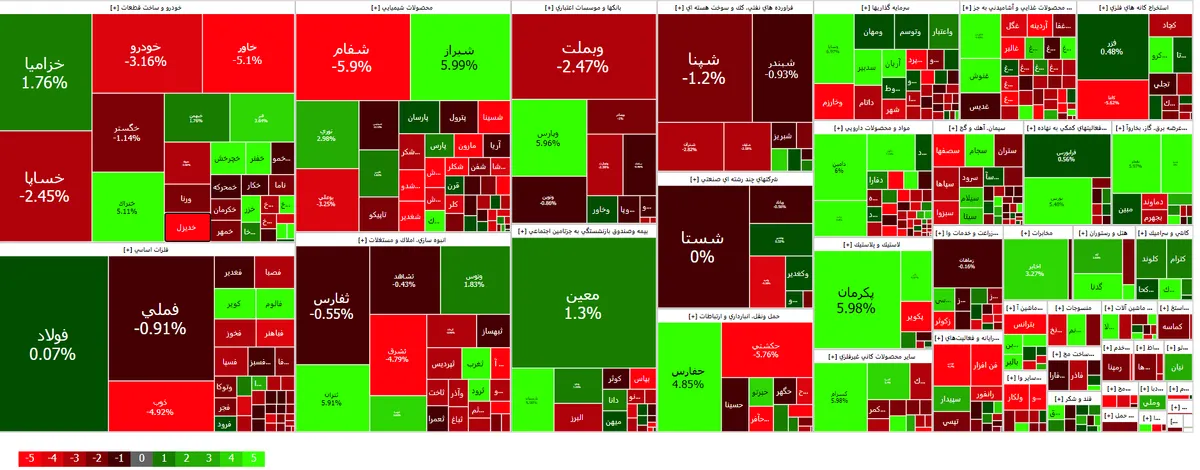 شاخص هموزن در جریان معاملات روز جاری با ۸۰۴ واحد افزایش به ۷۱۰ هزار و ۷۳ واحد و شاخص قیمت (وزنی- ارزشی) با یک هزار و ۳۶ واحد کاهش به ۴۴۸ هزار و ۴۶۳ واحد رسید.