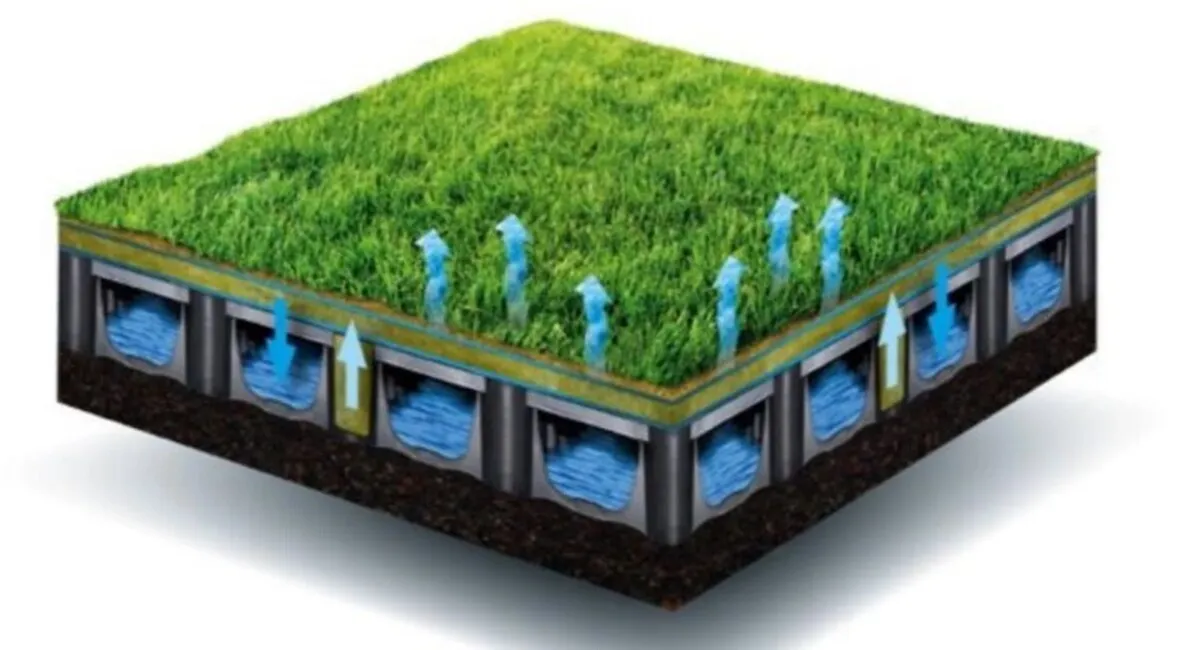 پژوهشگران KWR، سیستمهای برداشت آب باران و آبیاری مویرگی را برای خنک کردن چمن مصنوعی ترکیب کردند. در چنین سیستمی، یک لایه ذخیره آب باز، درست زیر چمن و پد شوک چمن مصنوعی برای برداشت آب باران ساخته میشود. این لایه حاوی استوانههایی است که این آب را به چمن مصنوعی برمی گرداند، در آنجا تبخیر شده و چمن را خنک میکند.