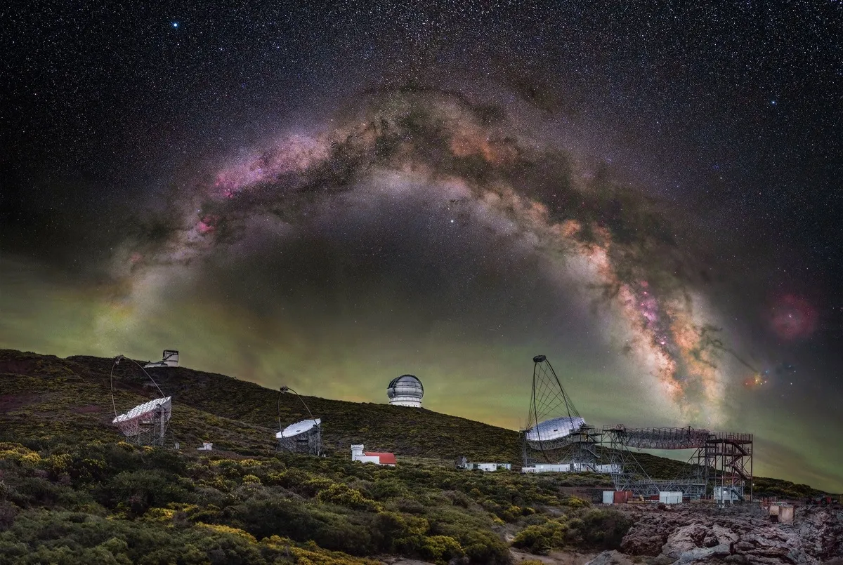 رصدخانه نجومی در لا پالما، جزیره قناری، اسپانیا یکی از مهم ترین رصدخانههای جهان است. این تصویر در 06/08/2024 ساعت 02:23 بامداد توسط فردی به نام خوزه پدررو (Jose Pedrero|) به اشتراک گذاشته شد. این نقطه یکی از مرتفع ترین و خشک ترین نقاط اروپا برای رصد نجومی است که در حدود ۲۳۹۶ متر بالاتر از سطح دریا قرار دارد. این رصدخانه تلسکوپهای بین المللی مانند Gran Telescopio Canarias (GTC) و Telescopio Nazionale Galileo (TNG) را در خود جای میدهد. ارتفاع زیاد، جو پایدار و آلودگی نوری کم شرایط استثنایی را برای تحقیقات نجومی فراهم میکند. خوزه از تجهیزات Canon Eos R5، Canon Eos R Astromodified، Canon lens 85mm، Sigma Art Lens 28mm، Rollei Tripod و Benro Polaris Tracker برای گرفتن عکسها استفاده کرد.