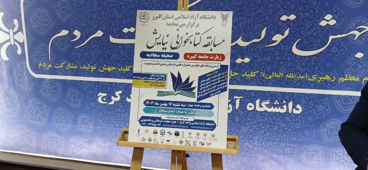 مسابقه کتابخوانی نیایش از سری برنامههای چهارمین جشنواره امامت و مهدویت دانشگاه آزاد اسلامی با موضوعات زیارت جامعه کبیره و صحیفه سجادیه به میزبانی دانشگاه آزاد اسلامی استان البرز برگزار خواهد شد.