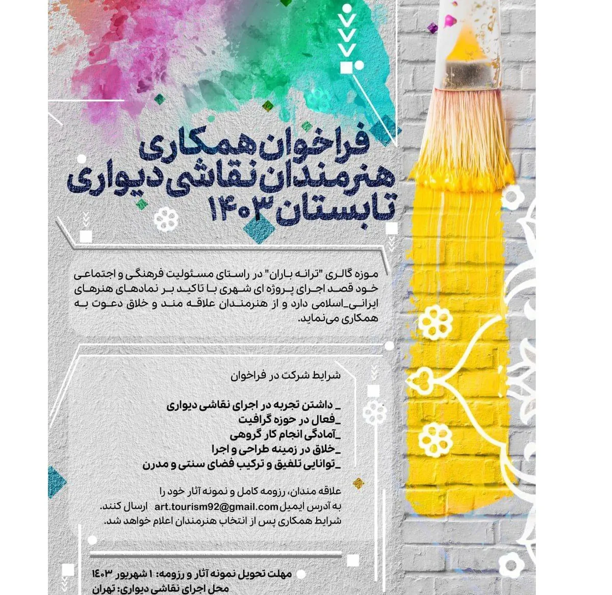 مهلت تحویل نمونه آثار و رزومه: ۱ شهریور ۱۴۰۳، محل اجرای نقاشی دیواری: تهران