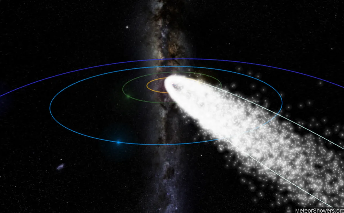 انیمیشن زیر جریان شهاب سنگی را نشان میدهد که به دور خورشید میچرخد. هر سال وقتی زمین به این جریان نزدیک میشود، شاهد بارش شهابی برساووشی هستیم. در انیمیشن، بقایای دنبالهدار درخشان به نظر میرسد، اما معمولاً کمنور هستند. تنها مقدار کمی از این سنگهای نجومی وارد جو زمین میشود.