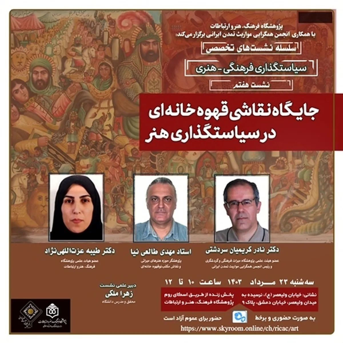 در این نشست، نادر کریمان سردشتی (دکترای تاریخ علوم و دکترای زبان و ادبیات فارسی، عضو هیئت علمی پژوهشگاه میراث فرهنگی و گردشگری و رئیس انجمن همگرایی مواریث تمدن ایرانی)، مهدی طالعی نیا (دارای درجه یک هنری از وزارت میراث فرهنگی، گردشگری و صنایع دستی، پژوهشگر حوزه هنرهای میراثی و نقاش مکتب نوقهوهخانهای) و طیبه عزت اللهینژاد (سرپرست پژوهشکده هنر پژوهشگاه فرهنگ، هنر و ارتباطات) سخنرانی خواهند کرد.
