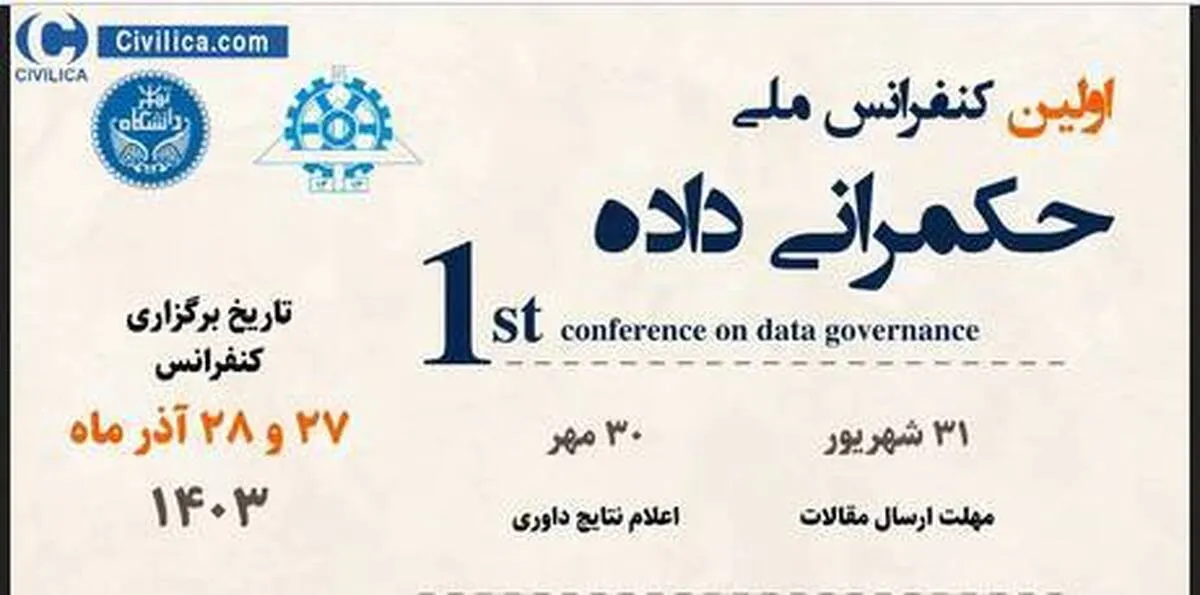 اولین کنفرانس ملی حکمرانی داده در روز دوشنبه، ۲۶ آذر، ۱۴۰۳ لغایت سه شنبه، ۲۷ آذر، ۱۴۰۳ توسط دانشگاه تهران، دانشکدگان فنی دانشگاه تهران و تحت حمایت سیویلیکا در شهر تهران برگزار میشود.