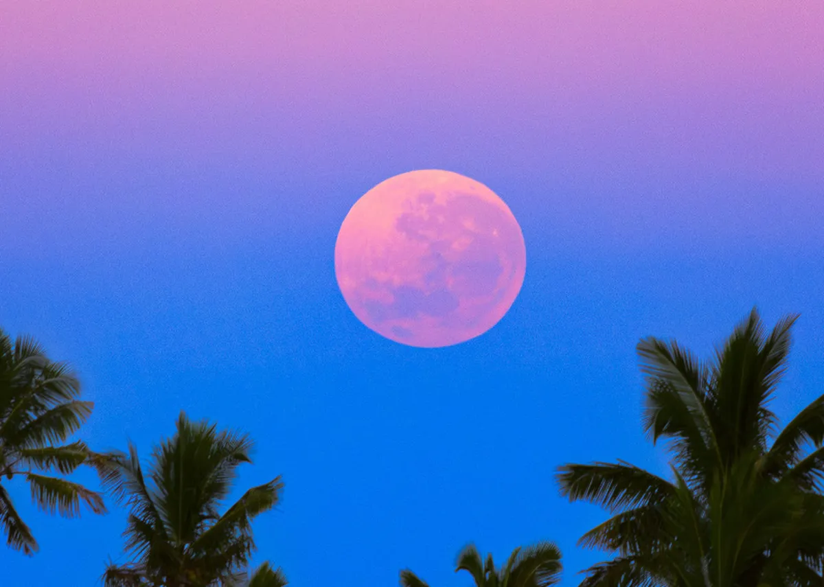 ماه کامل در این صحنه زیبا از یک جزیره قابل مشاهده است. این تصویر در صبح روز 20 اوت از فیجی در اقیانوس آرام جنوبی گرفته شده است. سایه زمین(Earth's shadow) تا بالای جو میرسد. در بالای آن یک درخشش صورتی به نام کمربند زهره (Belt of Venus) دیده میشود. این رنگ از نور قرمز طلوع خورشید در سراسر افق ناشی میشود. ماه در حال غروب نیز به دلیل مسیر طولانی در جو، قرمز به نظر میرسد.