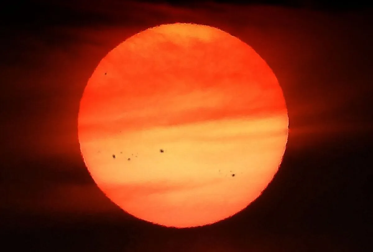 این تصویر در تاریخ 5 سپتامبر 2024 زمان 19:21 ، لکههای خورشیدی را در غروب خورشید نشان میدهد. تصویر توسط سیسیل کندی (Cecille Kennedy) ساحل اورگان ثبت شده است. سیسیل کندی با استفاده از Nikon P1000 مناطق لکههای خورشیدی را روی خورشید ثبت کرده است. عکاس میگوید: من یک عکس ثابت از را فیلم اسکرین شات گرفتم، سپس آن را در فتوشاپ برش دادم. در نهایت از Franzis 4Pro برای کنتراست دادن به لکههای خورشیدی استفاده کردم.