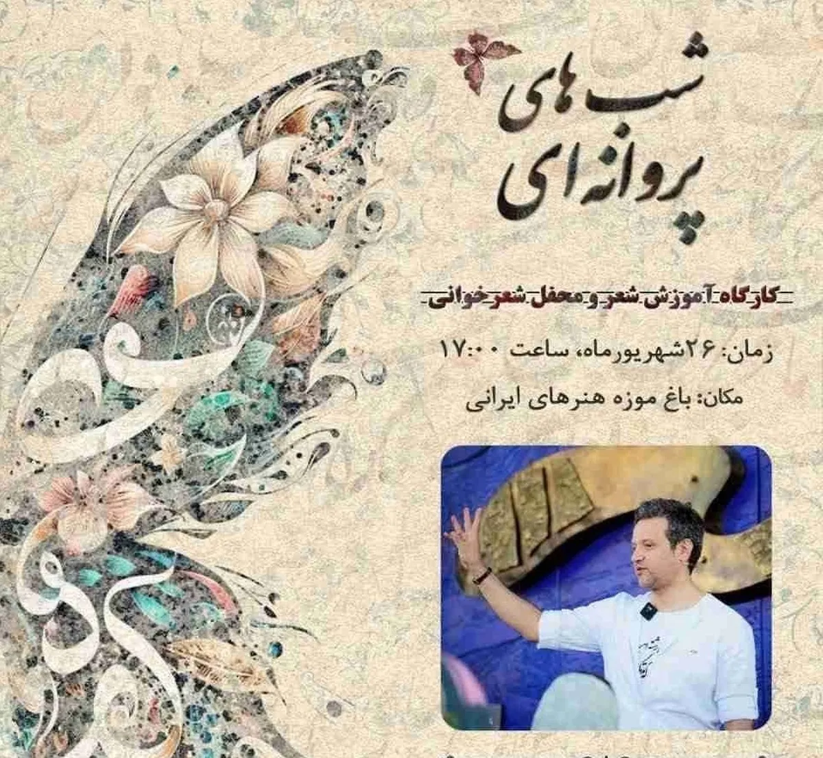کارگاه شبهای پروانهای به مناسبت شعر و ادب پارسی و روز بزرگداشت استاد شهریار در باغ موزه هنرهاي ايراني تشکیل میشود.