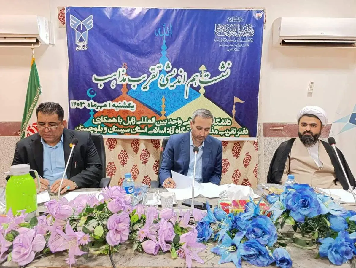 کامبیز نرماشیری سرپرست دانشگاه آزاد اسلامی استان سیستان و بلوچستان و واحد زاهدان در این مراسم با تبریک آغاز هفته دفاع مقدس و هفته وحدت گفت: دانشگاه آزاد اسلامی به عنوان بهترین دانشگاه در موضوع تقریب مذاهب اسلامی عمل کرده است، نخستین دفتر تقریب مذاهب اسلامی در استان سیستان و بلوچستان، آبان ۱۳۹۸ با حضور رئیس دانشگاه آزاد اسلامی در واحد زاهدان راهاندازی شد که از اهداف اصلی و اساسی این دفتر تقویت نقاط اشتراک و برقراری و استمرار تعاملات در میان مذاهب اسلامی در استان است.