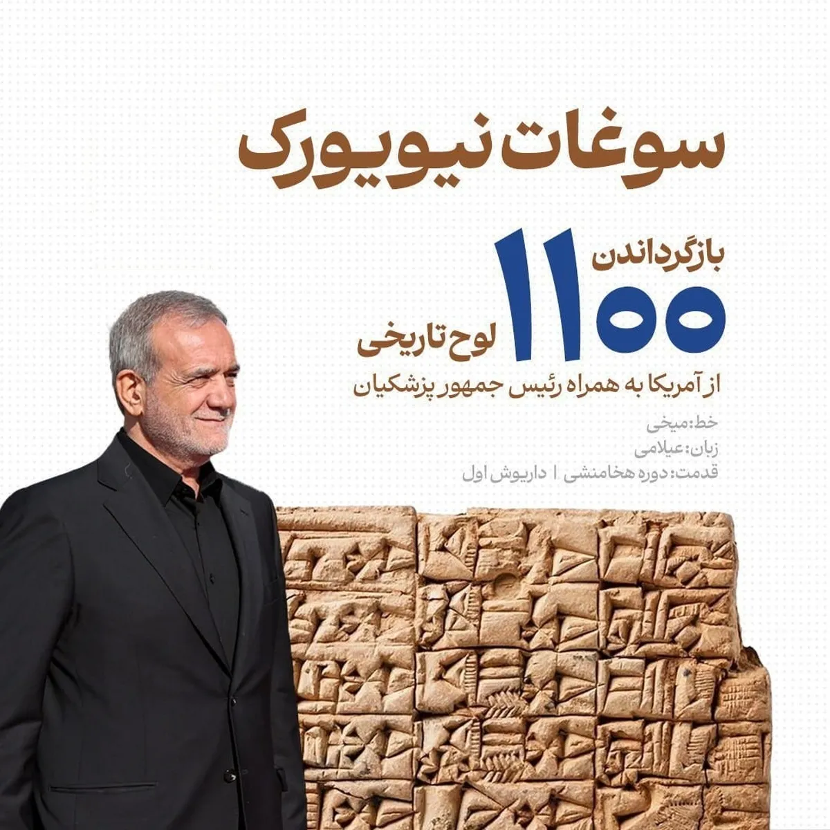 همزمان با بازگشت رئیس‌جمهور از نیویورک، ۱۱۰۰ لوح تاریخی متعلق به دوران هخامنشی و داریوش اول، از آمریکا به ایران بازگردانده شد.