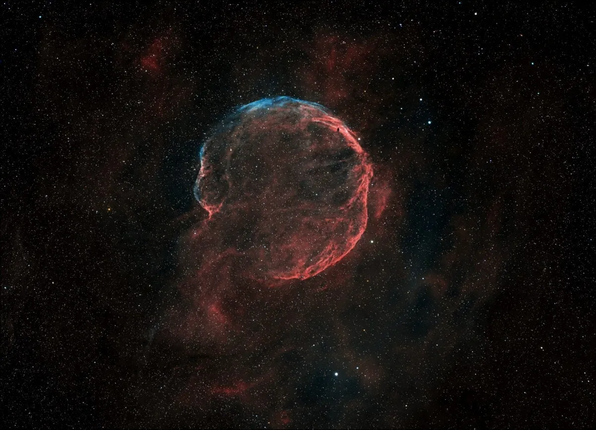 مایکل پی.کالیگیوری (Michael P. Caligiuri) این تصویر را از کارلزباد، کالیفرنیا ثبت کرد. CTB 1 (آبل 85) یک باقیمانده ابرنواختر کم نور است که در صورت فلکی ذاتالکرسی قرار دارد و حدود 9800 سال نوری از ما فاصله دارد. جورج آبل ستاره شناس آمریکایی دههها پیش در هنگام رصد این منظره در ابتدا فکر کرد که این سحابی از نوع سیاره ای است. عرض CTB 1 بیش از نیم درجه است که آن را بزرگتر از ماه کامل میکند. تصویر Hα/OIII/RGB با استفاده از یک انکسارگر 4.2 اینچی در f/5 با زمان کلی نوردهی 8.25 ساعت گرفته شد.