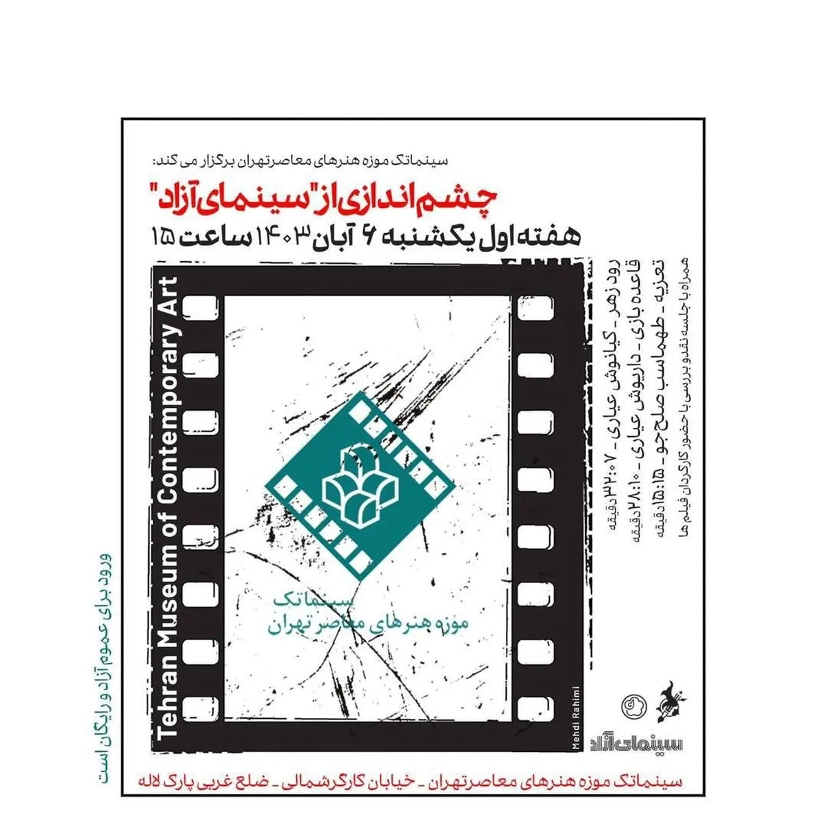 گزیده‌ای از فیلم‌های جنبش «سینمای آزاد» همراه با جلسه گفتگو، روز یکشنبه ۶ آبان ماه ساعت ۱۵ با همکاری فیلمخانه ملی ایران در سالن سینما تک موزه هنر‌های معاصر تهران به نمایش در می‌آید.